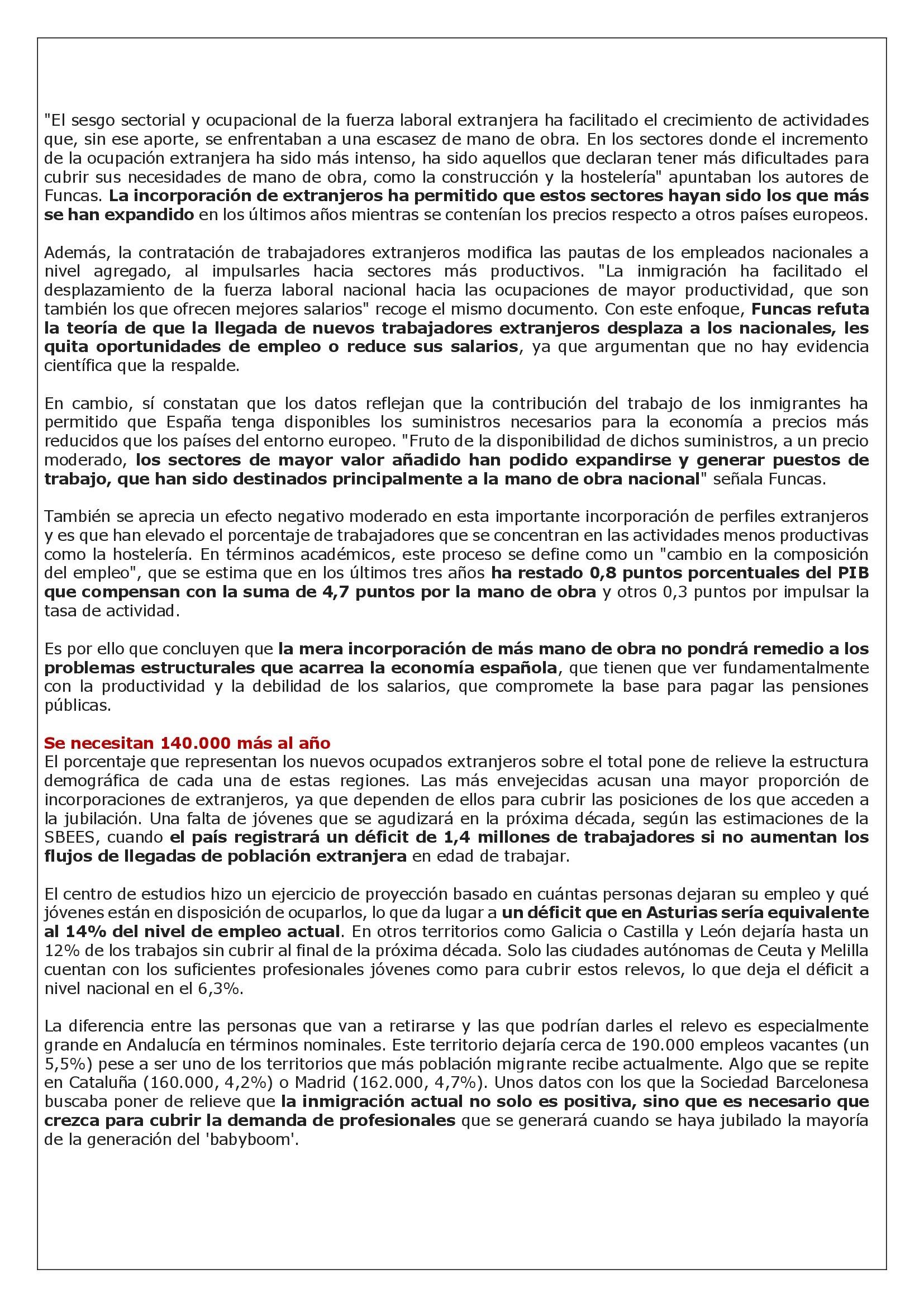 «El sesgo sectorial y ocupacional de la fuerza laboral extranjera ha facilitado el crecimiento de actividades que, sin ese aporte, se enfrentaban a una escasez de mano de obra. En los sectores donde el incremento de la ocupación extranjera ha sido más intenso, ha sido aquellos que declaran tener más dificultades para cubrir sus necesidades de mano de obra, como la construcción y la hostelería» apuntaban los autores de Funcas. La incorporación de extranjeros ha permitido que estos sectores hayan sido los que más se han expandido en los últimos años mientras se contenían los precios respecto a otros países europeos.