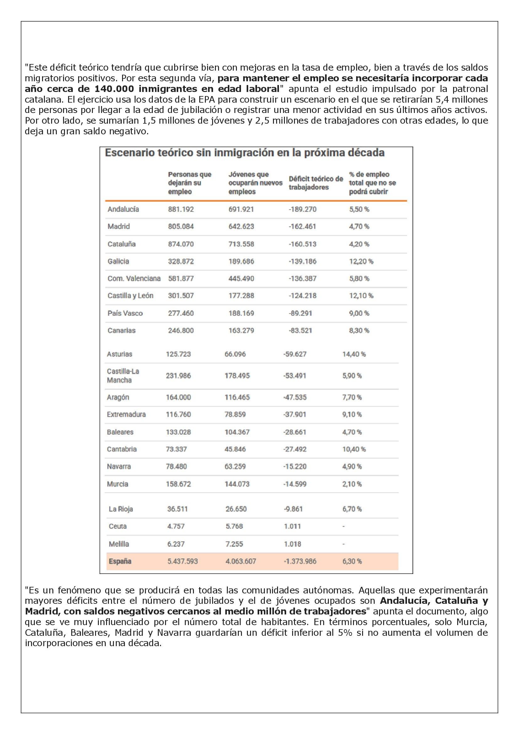 «Este déficit teórico tendría que cubrirse bien con mejoras en la tasa de empleo, bien a través de los saldos migratorios positivos. Por esta segunda vía, para mantener el empleo se necesitaría incorporar cada año cerca de 140.000 inmigrantes en edad laboral» apunta el estudio impulsado por la patronal catalana. El ejercicio usa los datos de la EPA para construir un escenario en el que se retirarían 5,4 millones de personas por llegar a la edad de jubilación o registrar una menor actividad en sus últimos años activos. Por otro lado, se sumarían 1,5 millones de jóvenes y 2,5 millones de trabajadores con otras edades, lo que deja un gran saldo negativo.