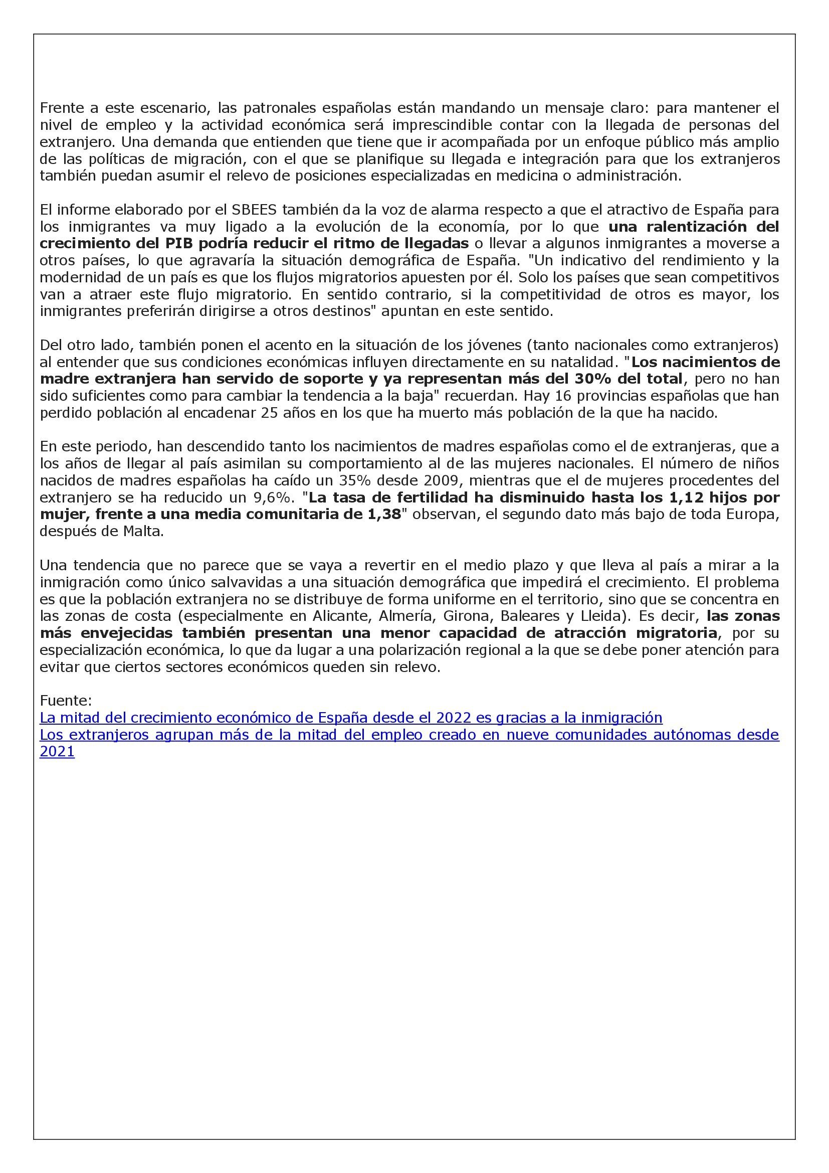 El informe elaborado por el SBEES también da la voz de alarma respecto a que el atractivo de España para los inmigrantes va muy ligado a la evolución de la economía, por lo que una ralentización del crecimiento del PIB podría reducir el ritmo de llegadas o llevar a algunos inmigrantes a moverse a otros países, lo que agravaría la situación demográfica de España. «Un indicativo del rendimiento y la modernidad de un país es que los flujos migratorios apuesten por él. Solo los países que sean competitivos van a atraer este flujo migratorio. En sentido contrario, si la competitividad de otros es mayor, los inmigrantes preferirán dirigirse a otros destinos» apuntan en este sentido.