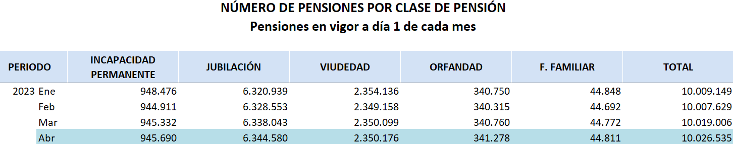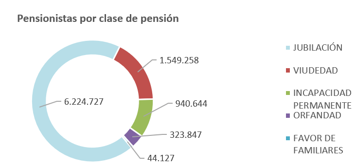 De las 10.026.535 pensiones contributivas abonadas, 6.344.580 son de jubilación, 2.350.176 de viudedad, 945.690 de incapacidad permanente, 341.278 de orfandad y 44.811 en favor de familiares. El número de pensiones crece a un ritmo interanual del 1%.