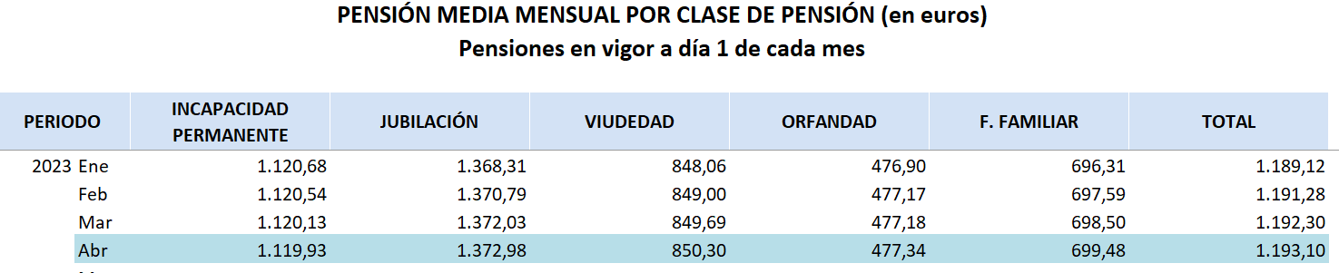La pensión media del sistema asciende en abril a 1.193,1 euros mensuales. Esta cuantía, comprende las distintas clases de pensión (jubilación, incapacidad permanente, viudedad, orfandad y en favor de familiares).