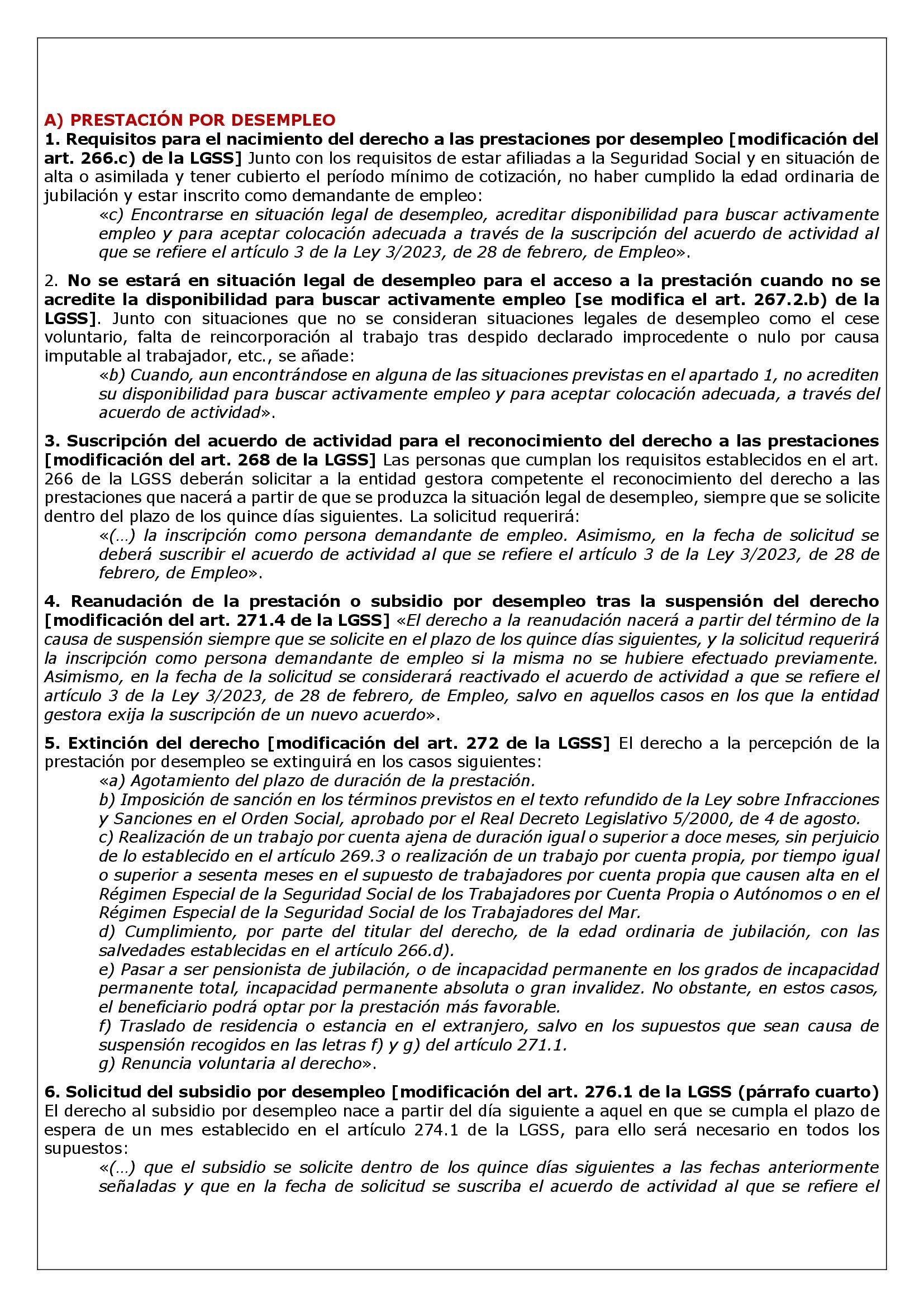 - Reanudación de la prestación o subsidio por desempleo tras la suspensión del derecho [modificación del art. 271.4 de la LGSS] «El derecho a la reanudación nacerá a partir del término de la causa de suspensión siempre que se solicite en el plazo de los quince días siguientes, y la solicitud requerirá la inscripción como persona demandante de empleo si la misma no se hubiere efectuado previamente. Asimismo, en la fecha de la solicitud se considerará reactivado el acuerdo de actividad a que se refiere el artículo 3 de la Ley 3/2023, de 28 de febrero, de Empleo, salvo en aquellos casos en los que la entidad gestora exija la suscripción de un nuevo acuerdo».