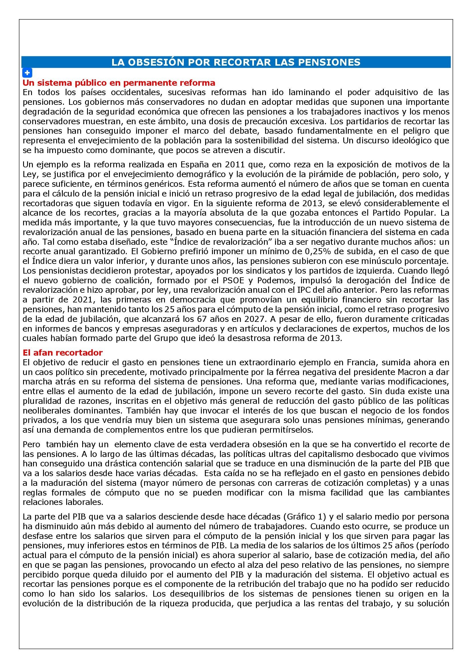 El objetivo de reducir el gasto en pensiones tiene un extraordinario ejemplo en Francia, sumida ahora en un caos político sin precedente, motivado principalmente por la férrea negativa del presidente Macron a dar marcha atrás en su reforma del sistema de pensiones. Una reforma que, mediante varias modificaciones, entre ellas el aumento de la edad de jubilación, impone un severo recorte del gasto. Sin duda existe una pluralidad de razones, inscritas en el objetivo más general de reducción del gasto público de las políticas neoliberales dominantes. También hay que invocar el interés de los que buscan el negocio de los fondos privados, a los que vendría muy bien un sistema que asegurara solo unas pensiones mínimas, generando así una demanda de complementos entre los que pudieran permitírselos.