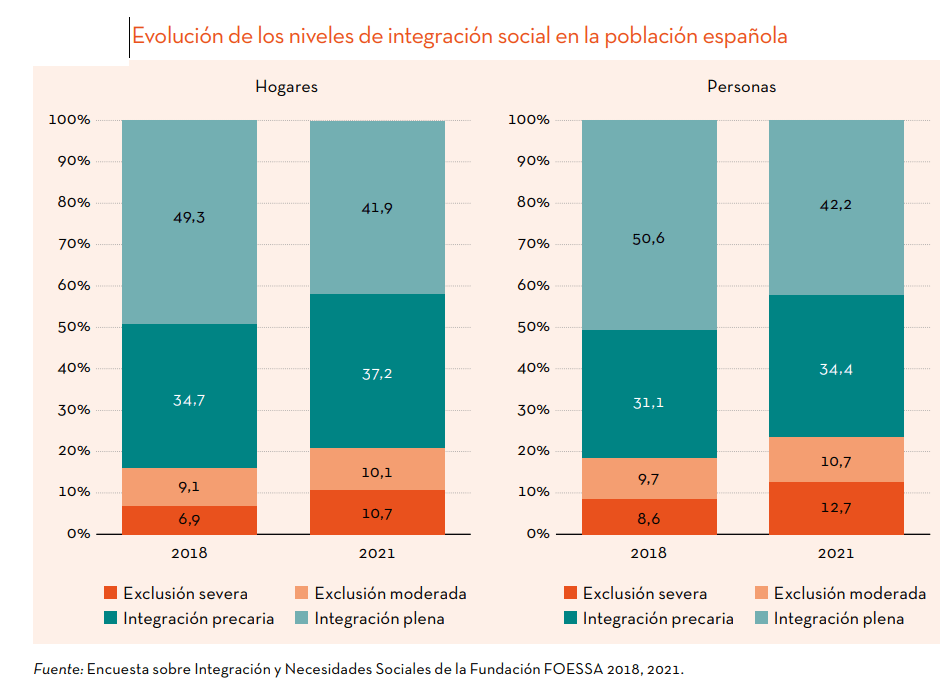 Según el informe, se aprecia un empeoramiento generalizado de los niveles de integración para el conjunto de la población: han aumentado las familias en situación de pobreza pero también se han reducido los hogares sin problemas de exclusión, que son el 41,2% cuando en 2018 eran el 49,3%. «Se ha producido un deslizamiento de los diferentes estratos de la sociedad hacia situaciones de mayor precariedad y exclusión social. Una fuga imparable hacia una sociedad más desigual, donde el grupo que más crece es el de los más desfavorecidos», ha aseverado.