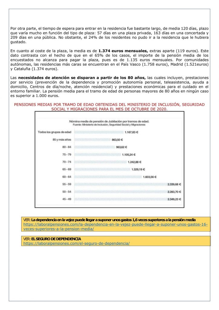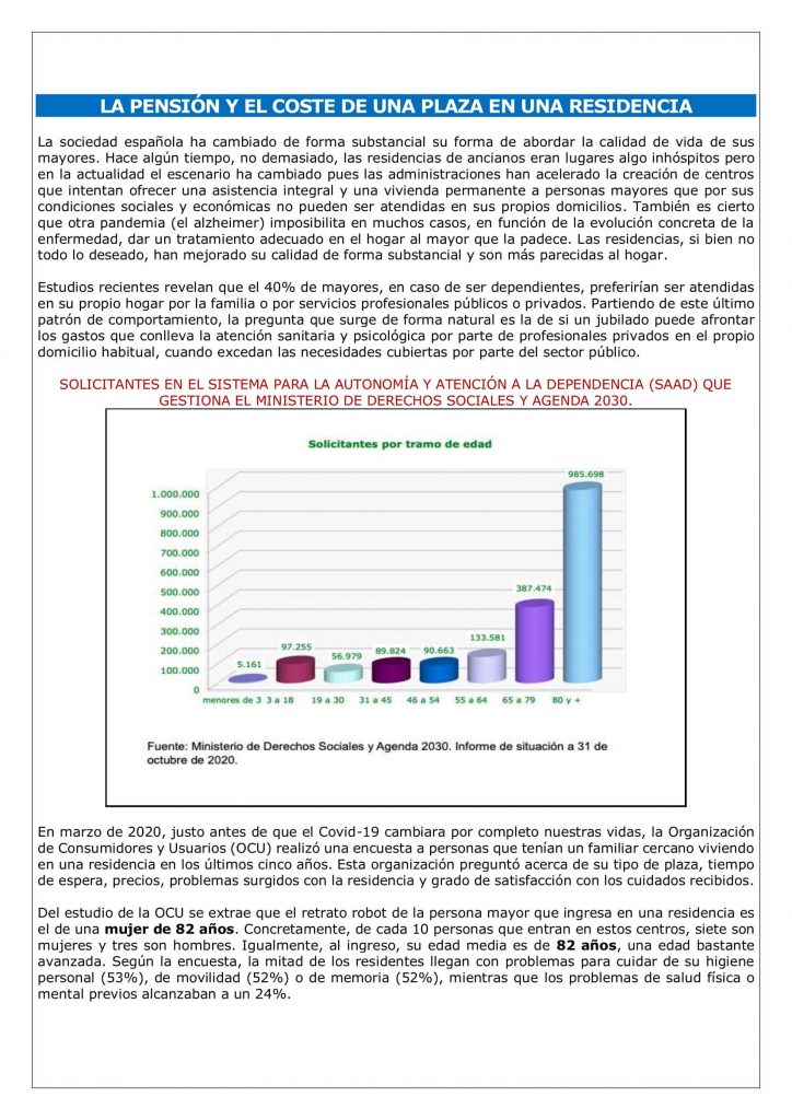Las necesidades de atención se disparan a partir de los 80 años, las cuales incluyen, prestaciones por servicio (prevención de la dependencia y promoción autonomía personal, teleasistencia, ayuda a domicilio, Centros de día/noche, atención residencial) y prestaciones económicas para el cuidado en el entorno familiar. La pensión media para el tramo de edad de personas mayores de 80 años en ningún caso es superior a 1.000 euros.