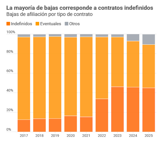 Ahí se aprecia que las bajas de indefinidos han pasado del 13,5% en 2019 al 44,5% en la primera mitad de 2025. Este porcentaje fue algo superior en 2020 y 2021 por el efecto de parálisis del mercado laboral comentado, pero no llegó a rebasar el peso de los temporales. Ahora sí.