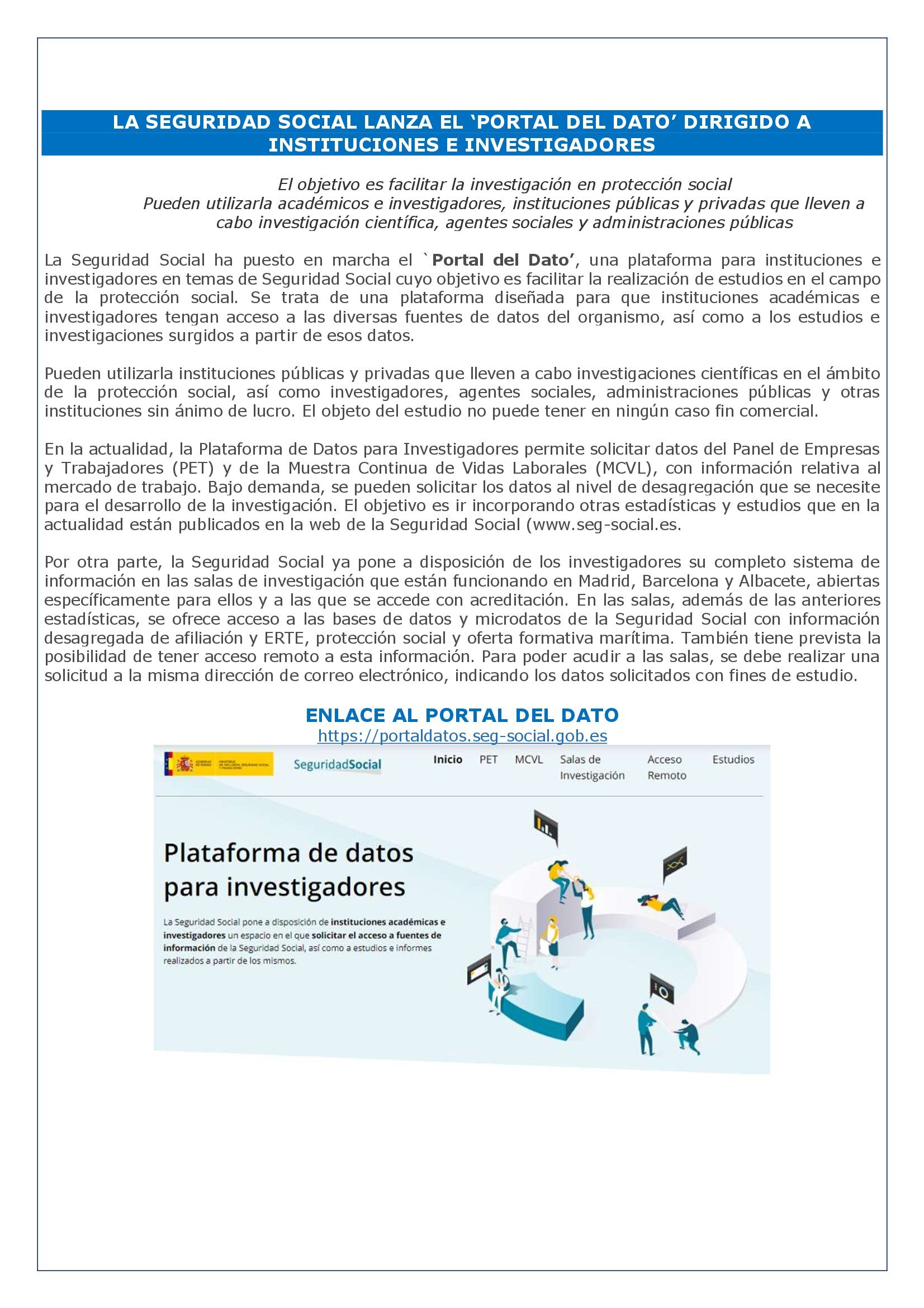 La Seguridad Social ha puesto en marcha el `Portal del Dato’, una plataforma para instituciones e investigadores en temas de Seguridad Social cuyo objetivo es facilitar la realización de estudios en el campo de la protección social. Se trata de una plataforma diseñada para que instituciones académicas e investigadores tengan acceso a las diversas fuentes de datos del organismo, así como a los estudios e investigaciones surgidos a partir de esos datos.