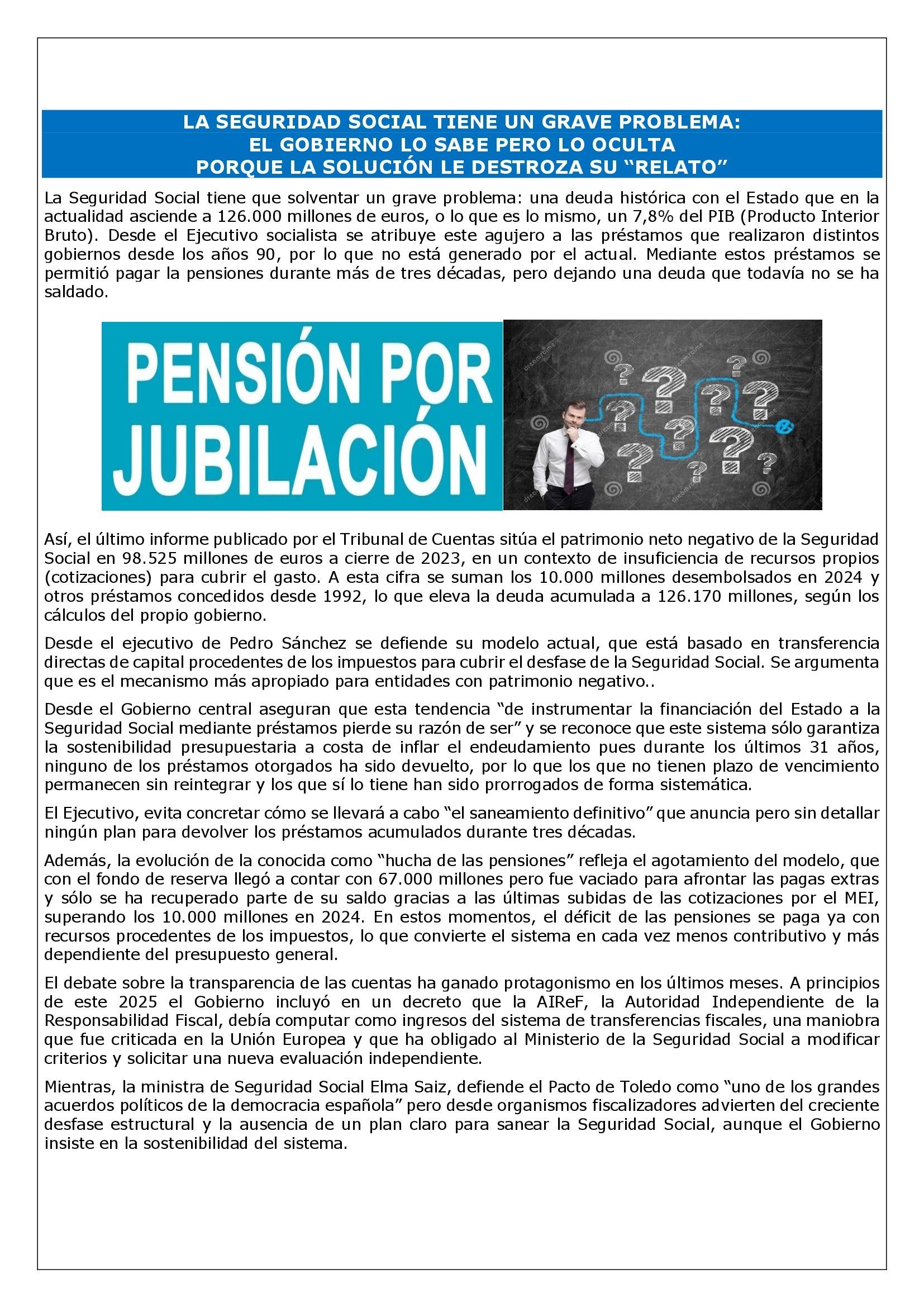 Mientras, la ministra de Seguridad Social Elma Saiz, defiende el Pacto de Toledo como “uno de los grandes acuerdos políticos de la democracia española” pero desde organismos fiscalizadores advierten del creciente desfase estructural y la ausencia de un plan claro para sanear la Seguridad Social, aunque el Gobierno insiste en la sostenibilidad del sistema.