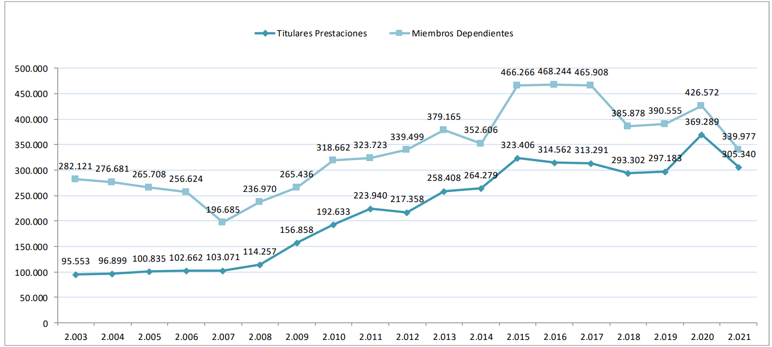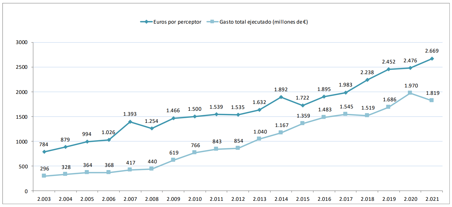 Estas cuantías se han ido mejorando con los años, pero su evolución no ha sido muy espectacular. Al menos no tanto como el aumento del número de quienes las reciben. El informe proporciona datos desde 2003, año en que comenzó la recogida sistemática de información sobre estas rentas autonómicas. Los titulares se han triplicado, pasando de sólo 95.533 en 2003 a 305.340 en 2021. El número de miembros dependientes ha crecido un 121%.