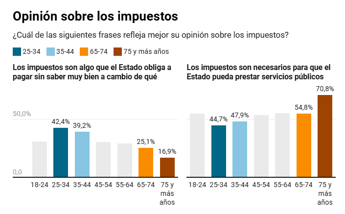 Los impuestos son una de las principales fuentes de ingresos de las administraciones públicas, aunque su acogida es desigual en los distintos grupos de población, por ejemplo, según la edad. Los adultos jóvenes son los que más ponen en cuestión su necesidad y los que perciben en menor medida que el pago de impuestos se traduzca en prestaciones a su favor. En cambio, los mayores de 65 años manifiestan una mayor confianza en el sistema tributario y se muestran más satisfechos con el funcionamiento de los servicios públicos, sobre todo con las pensiones y el transporte público.