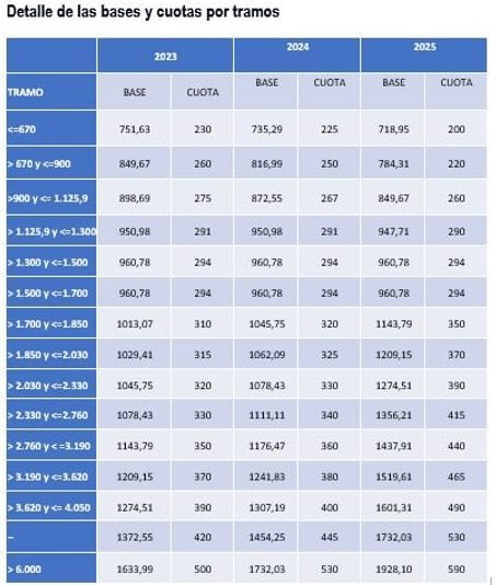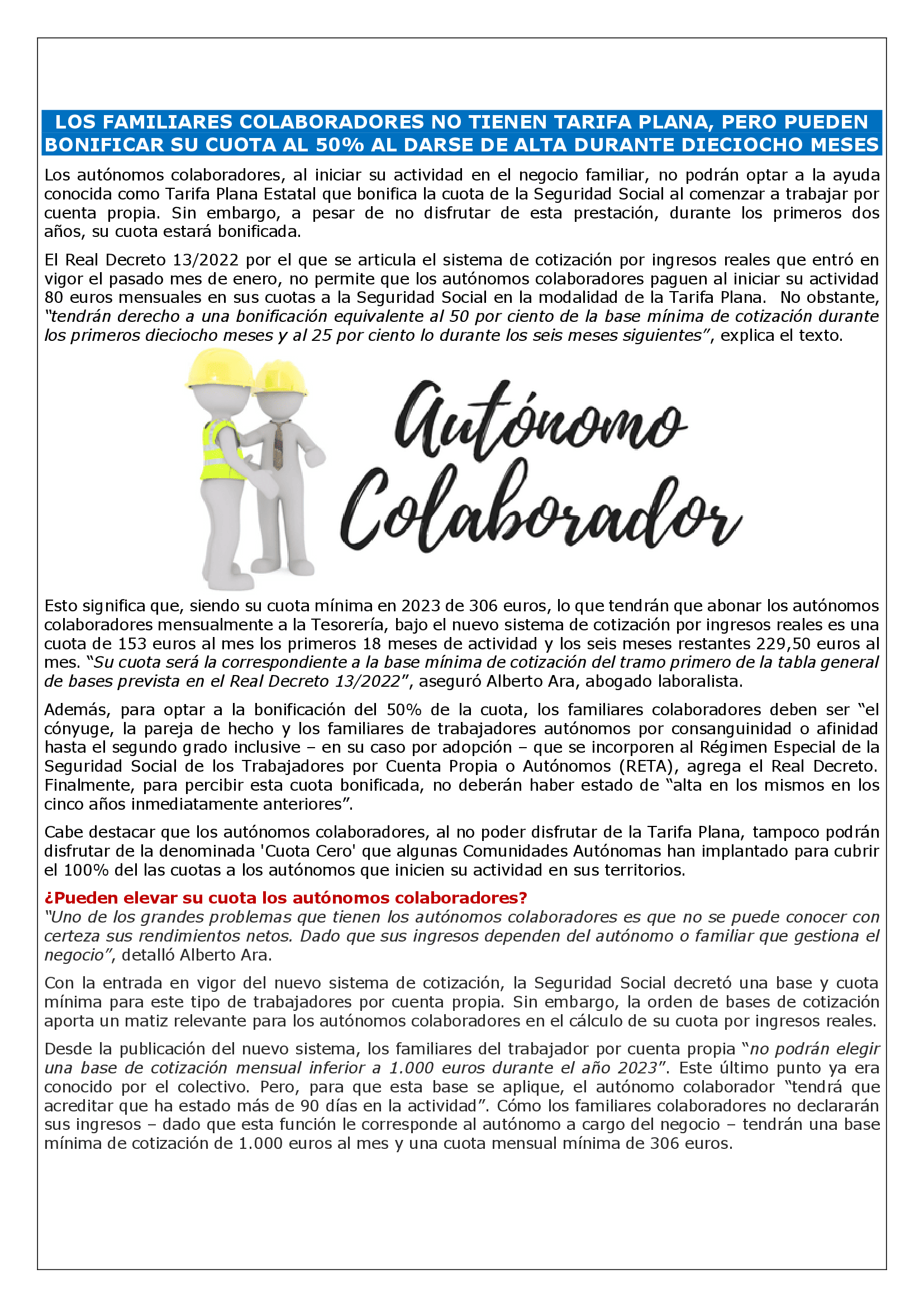 Esto significa que, siendo su cuota mínima en 2023 de 306 euros, lo que tendrán que abonar los autónomos colaboradores mensualmente a la Tesorería, bajo el nuevo sistema de cotización por ingresos reales es una cuota de 153 euros al mes los primeros 18 meses de actividad y los seis meses restantes 229,50 euros al mes. “Su cuota será la correspondiente a la base mínima de cotización del tramo primero de la tabla general de bases prevista en el Real Decreto 13/2022”, aseguró Alberto Ara, abogado laboralista.