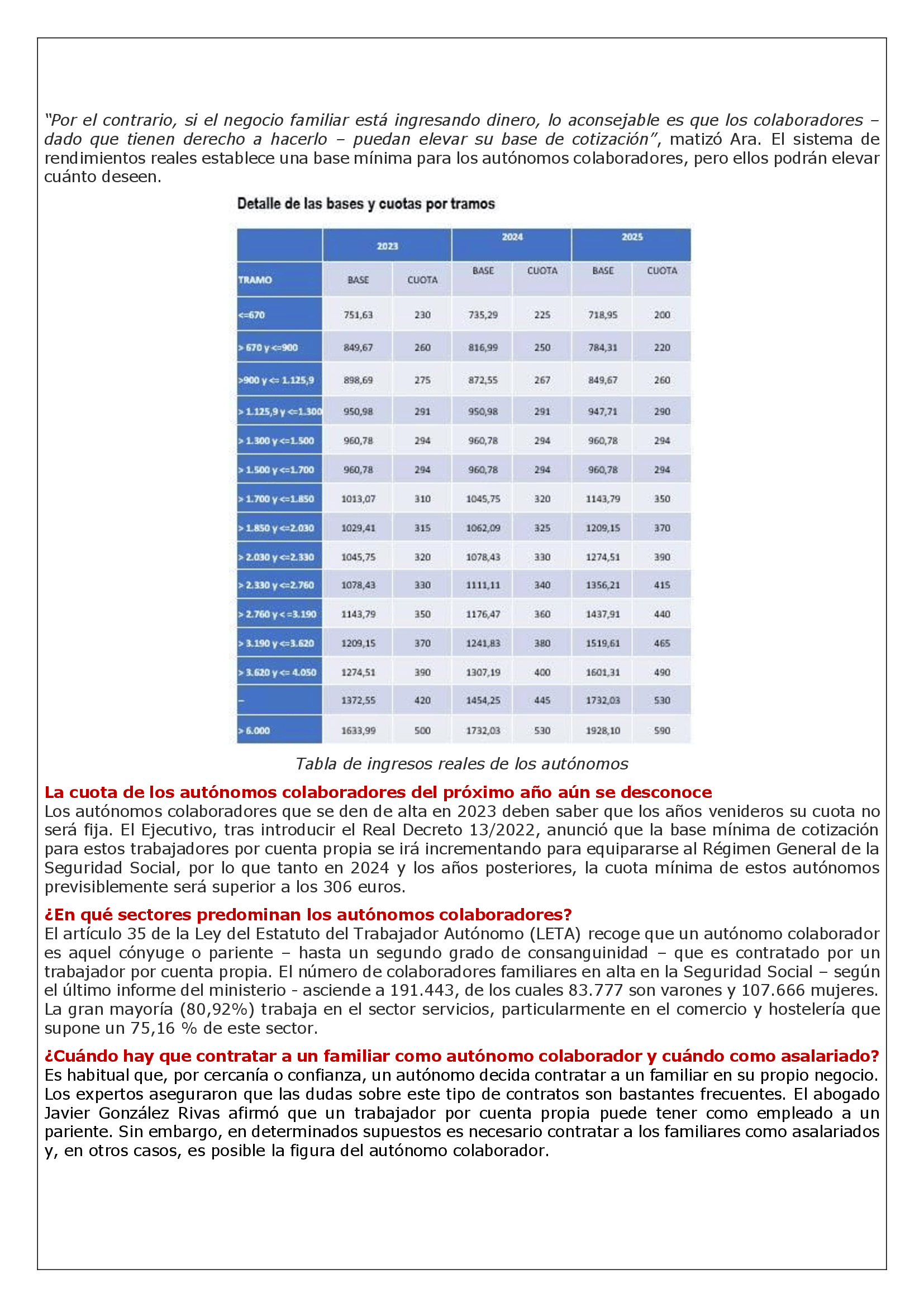 “Por el contrario, si el negocio familiar está ingresando dinero, lo aconsejable es que los colaboradores – dado que tienen derecho a hacerlo – puedan elevar su base de cotización”, matizó Ara. El sistema de rendimientos reales establece una base mínima para los autónomos colaboradores, pero ellos podrán elevar cuánto deseen.
