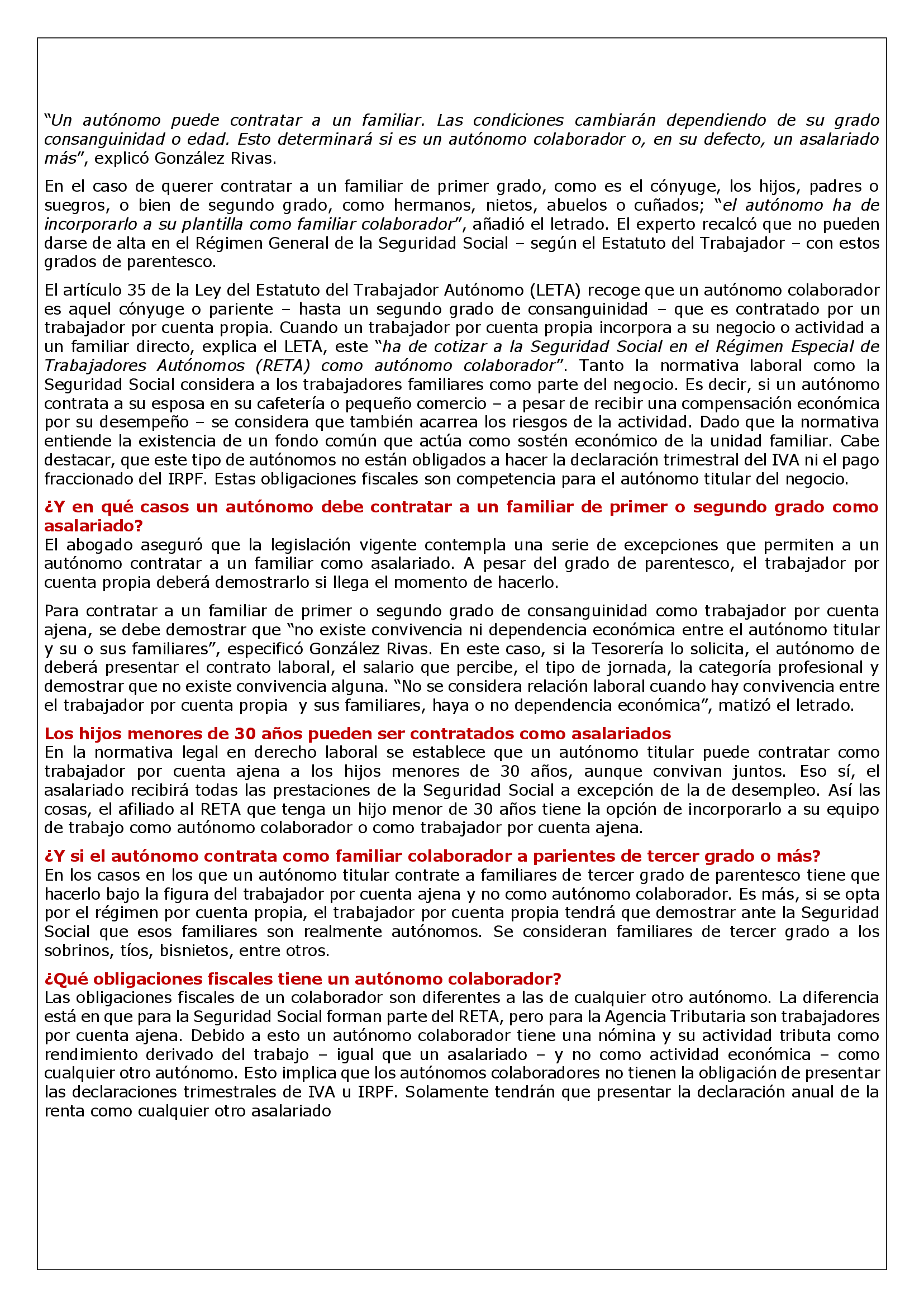 “Un autónomo puede contratar a un familiar. Las condiciones cambiarán dependiendo de su grado consanguinidad o edad. Esto determinará si es un autónomo colaborador o, en su defecto, un asalariado más”, explicó González Rivas.
