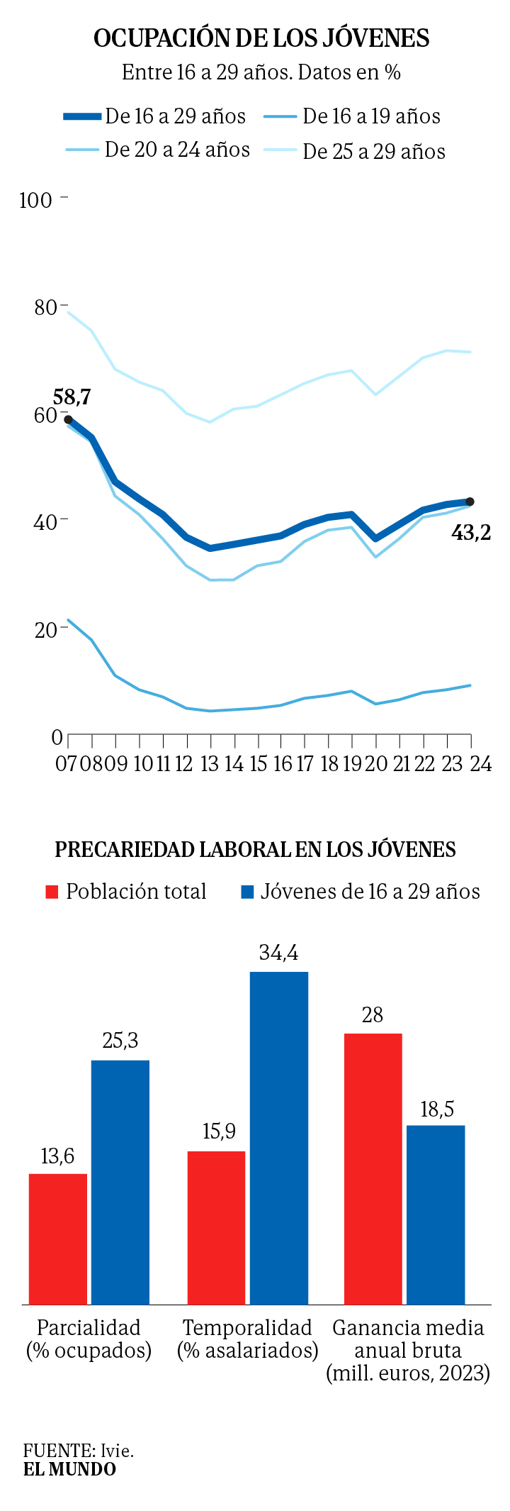 La elevada tasa de desempleo es, no obstante, sólo una cara de la moneda de la precariedad laboral que sufren los jóvenes. Del otro lado, la incorporación tardía al mercado de trabajo, con una tasa de empleo entre los 16 y los 29 años del 43,2%, 15 puntos inferior a la registrada en 2007, se ha convertido en el principal obstáculo para que los jóvenes de hoy en día logren completar carreras laborales suficientemente largas para cobrar una pensión que les permita mantener su nivel de vida.