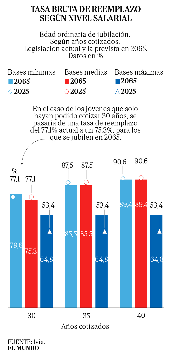 Con esta base, el informe apunta a que la reforma de Escrivá anticipa «un ligero ajuste» en la tasa de reemplazo futura de los jóvenes, de entre uno y dos puntos, respecto a la que se obtendría de mantenerse la legislación aplicada en 2025. «En el caso de los jóvenes que solo hayan podido cotizar 30 años, se pasaría de una tasa de reemplazo del 77,1% actual a un 75,3%, para los que se jubilen en 2065», ejemplifica.
