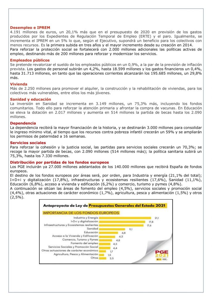 4.191 millones de euros, un 20,1% más que en el presupuesto de 2020 en previsión de los gastos producidos por los Expedientes de Regulación Temporal de Empleo (ERTE) y el paro. Igualmente, se incrementa el IPREM en un 5% lo que, según el Ejecutivo, supondrá un beneficio para los colectivos con menos recursos. Es la primera subida en tres años y el mayor incremento desde su creación en 2014.