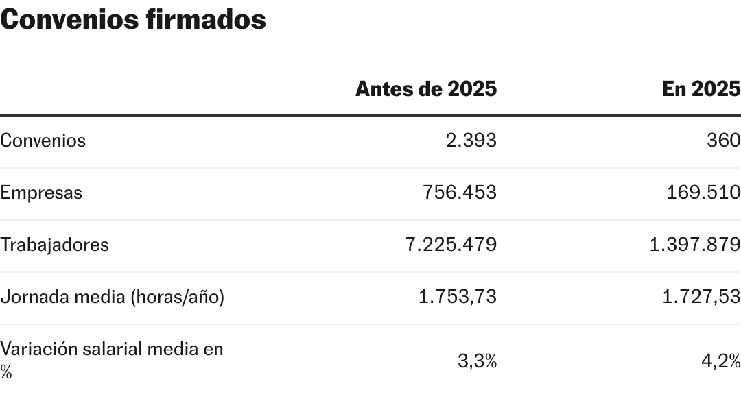 En cualquier caso, la tendencia salarial futura es positiva. El incremento del 3,46% hasta julio es una cifra promedia formada por las alzas recogidas en convenios firmados antes de 2025, pero con efectos económicos para este año —cuya subida media es del 3,3% para 7,2 millones de trabajadores—. Si se miran los incrementos de los convenios que sí se han firmado este mismo ejercicio, los aumentos medios ascienden al 4,3% y afectan a 1,4 millones de empleados.