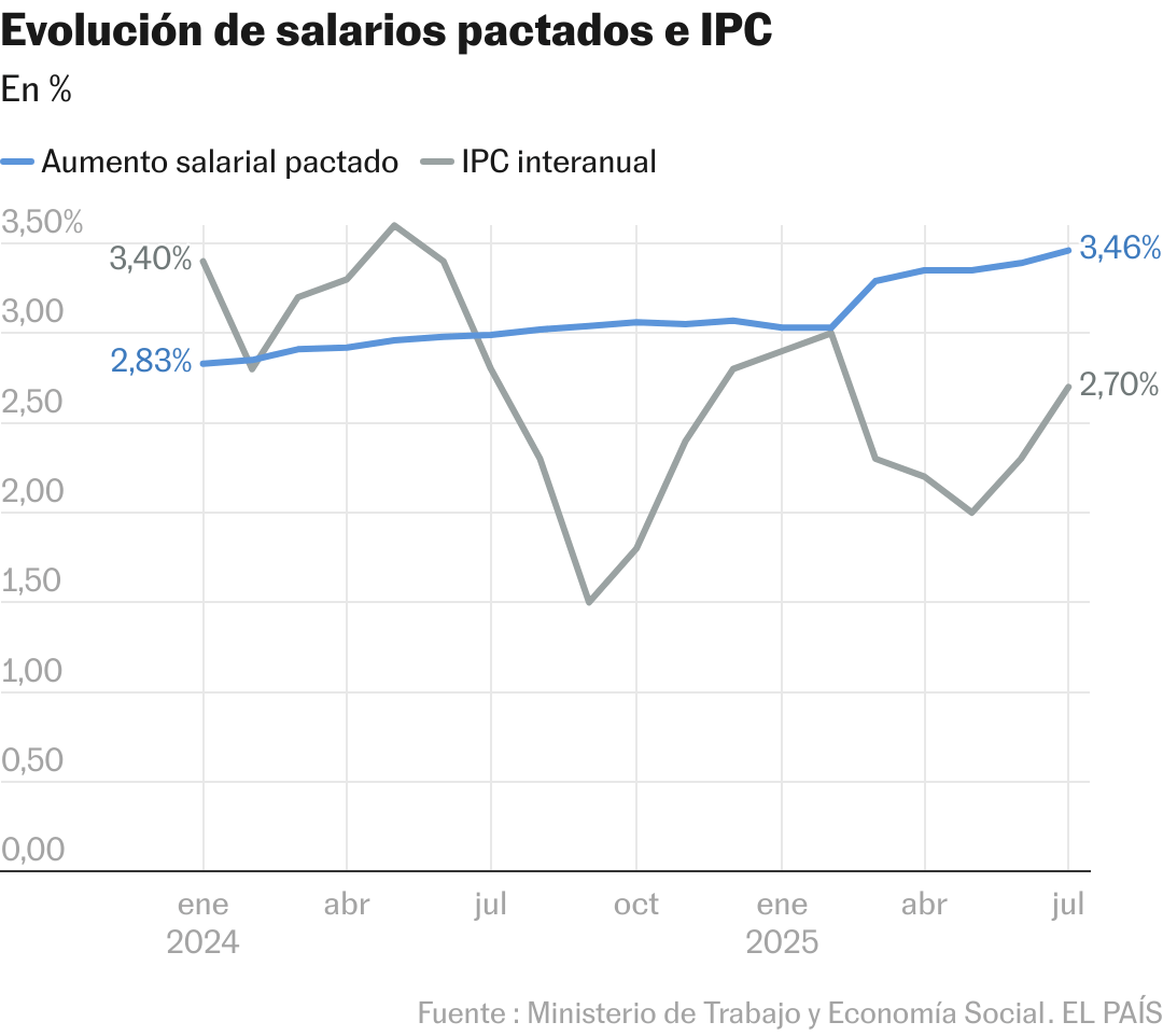 Los salarios medios pactados en los convenios colectivos de 8,6 millones de trabajadores que ya habían negociado sus condiciones laborales hasta julio han subido una media del 3,46%, según las cifras registradas en los siete primeros meses del año y publicadas este jueves por el Ministerio de Trabajo. El incremento salarial acordado en los convenios lleva un año, desde julio de 2024, subiendo por encima de la inflación, lo que supone ganancias de poder adquisitivo para la mayoría de estos asalariados.