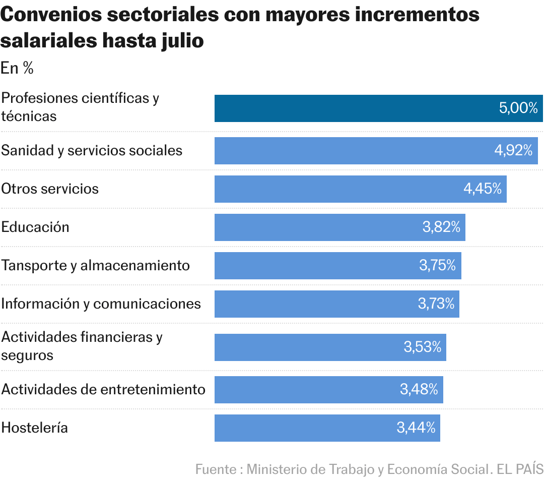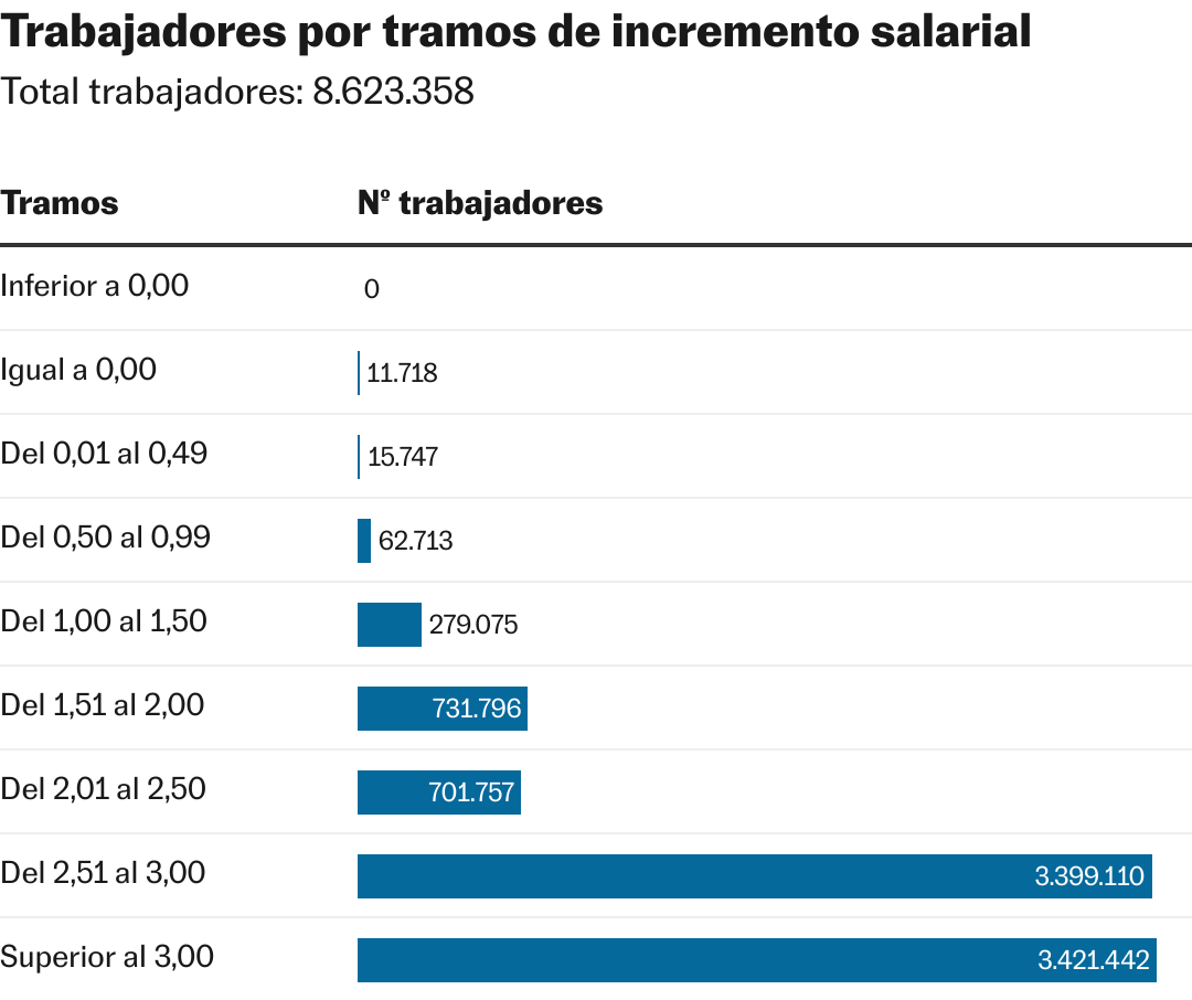 Al margen de los sectores, las cifras globales muestran que prácticamente ocho de cada diez trabajadores que ya han cerrado sus condiciones laborales de convenio en lo que va de año tienen subidas salariales del 2,5% o superiores. Entre los que se sitúan en la franja de aumentos que van del 2,5 y al 3%, el incremento medio es del 2,96%. Para aquellos que se ubican en la banda más alta, con alzas superiores al 3%, la subida media de sus sueldos escala hasta el 4,7% (en esta última franja hay 3,4 millones de trabajadores hasta julio).