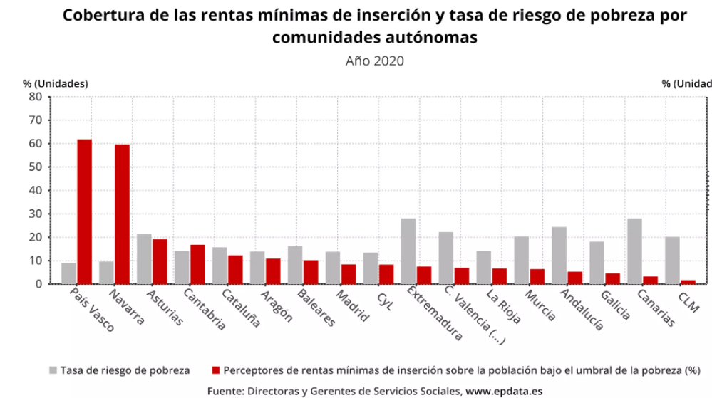 Solo el 9% de las personas en el umbral de la pobreza percibe rentas mínimas de inserción (RMI) que ofrecen las comunidades autónomas, según la Asociación de Directoras y Gerentes de Servicios Sociales (ADYGSS) que hace alusión al Informe de Rentas Mínimas de Inserción correspondiente al año 2020, que ha hecho público el Ministerio de Derechos Sociales. Este porcentaje encubre, según la asociación, «diferencias extremas». Así, destacan dos comunidades como País Vasco y Navarra, con porcentajes que suponen el 61,7% y el 59,6% respectivamente, de su población por debajo del umbral de la pobreza; seguidas de Asturias y Cantabria, donde reciben estas rentas casi una de cada 6 personas bajo el umbral de la pobreza.