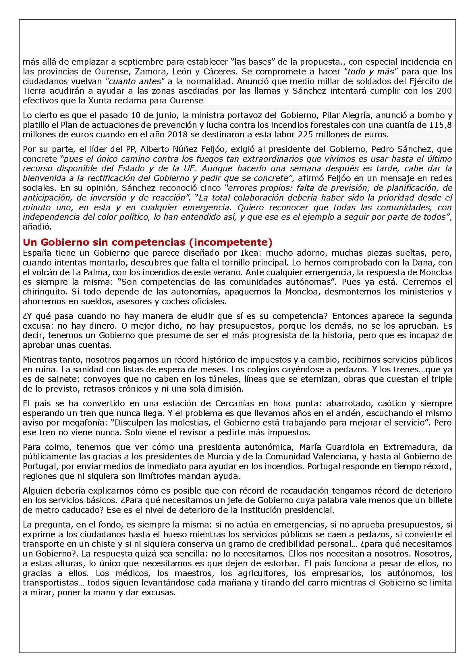 La oleada de incendios sigue castigando el noroeste de España. Sánchez ha anunciado que el Gobierno va a proponer un “pacto de estado para la mitigación y adaptación a la emergencia climática”, que implique a toda la sociedad civil, para que la respuesta y prevención de amenazas cuente con medios suficientes y quede fuera de la contienda política. No obstante, no ha dado detalles de en qué consistiría exactamente, más allá de emplazar a septiembre para establecer “las bases” de la propuesta., con especial incidencia en las provincias de Ourense, Zamora, León y Cáceres. Se compromete a hacer «todo y más» para que los ciudadanos vuelvan «cuanto antes» a la normalidad. Anunció que medio millar de soldados del Ejército de Tierra acudirán a ayudar a las zonas asediadas por las llamas y Sánchez intentará cumplir con los 200 efectivos que la Xunta reclama para Ourense