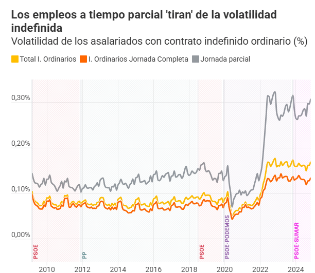 En esta última situación, se encuentran los que tienen una jornada reducida no deseada, que elevan su volatilidad diaria del 0,14% en 2021 0,3% de la afiliación, mientras los ordinarios lo han hecho del 0,09 % al 0,17%.