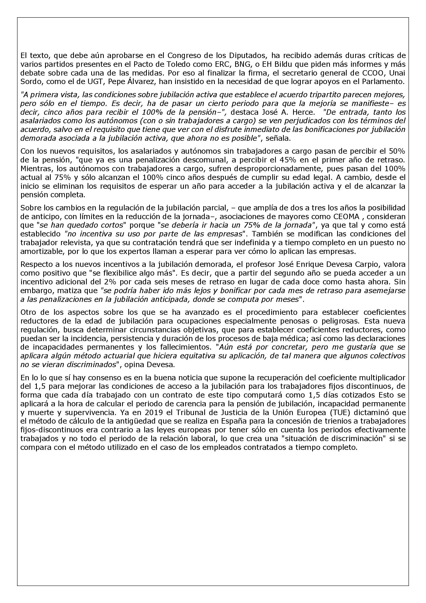 «Es una reforma muy limitada de las pensiones, cuyo principal novedad viene de la mano de la jubilación activa, que no va a ser tan positiva para todos como parece«, advierte José Antonio Herce. Mientras, la Coordinadora Estatal por la Defensa del Sistema Público de Pensiones (COESPE) critica los intentos de retrasar la edad de jubilación con esta última reforma .
