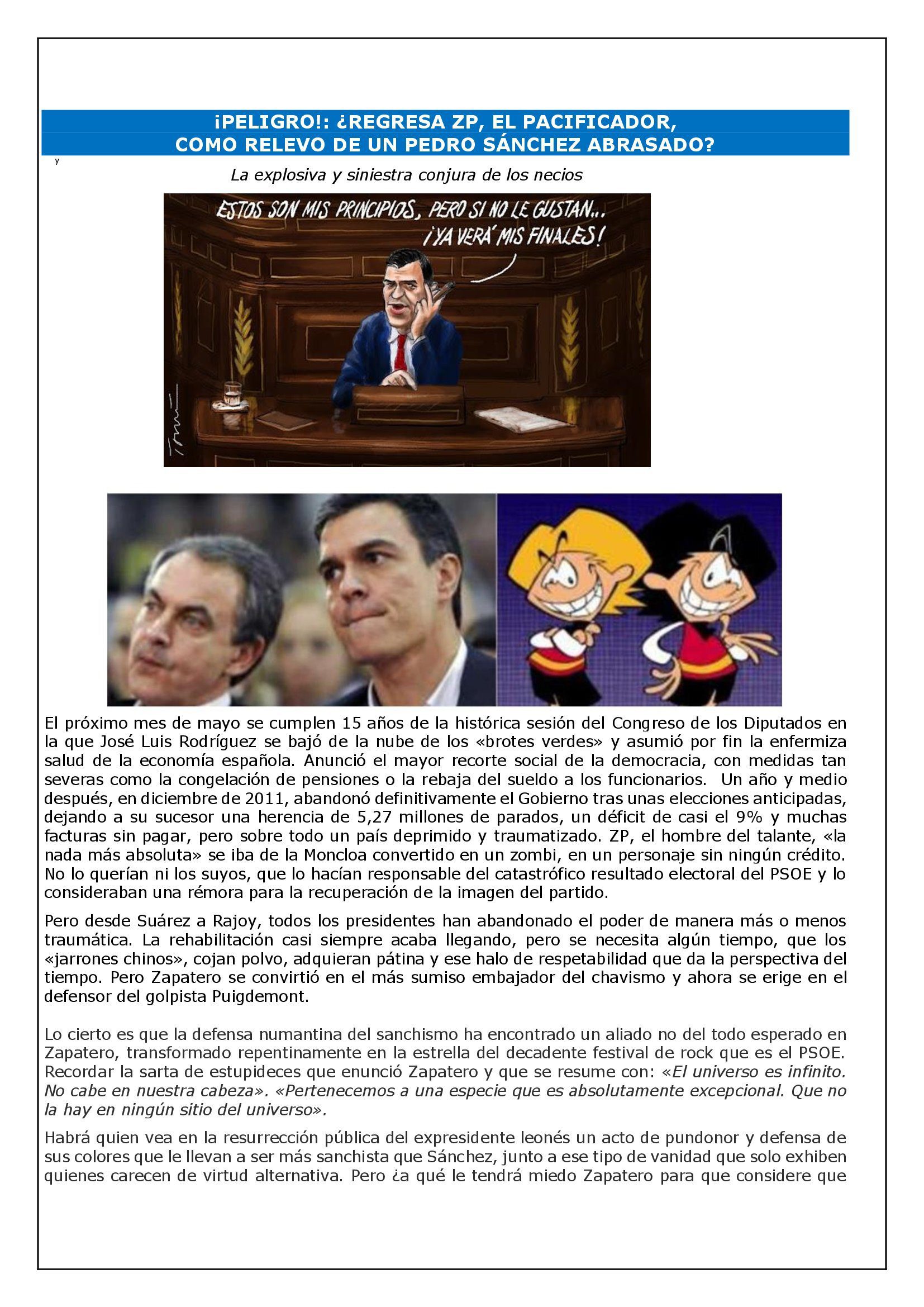 El próximo mes de mayo se cumplen 15 años de la histórica sesión del Congreso de los Diputados en la que José Luis Rodríguez se bajó de la nube de los «brotes verdes» y asumió por fin la enfermiza salud de la economía española. Anunció el mayor recorte social de la democracia, con medidas tan severas como la congelación de pensiones o la rebaja del sueldo a los funcionarios. Un año y medio después, en diciembre de 2011, abandonó definitivamente el Gobierno tras unas elecciones anticipadas, dejando a su sucesor una herencia de 5,27 millones de parados, un déficit de casi el 9% y muchas facturas sin pagar, pero sobre todo un país deprimido y traumatizado. ZP, el hombre del talante, «la nada más absoluta» se iba de la Moncloa convertido en un zombi, en un personaje sin ningún crédito. No lo querían ni los suyos, que lo hacían responsable del catastrófico resultado electoral del PSOE y lo consideraban una rémora para la recuperación de la imagen del partido.