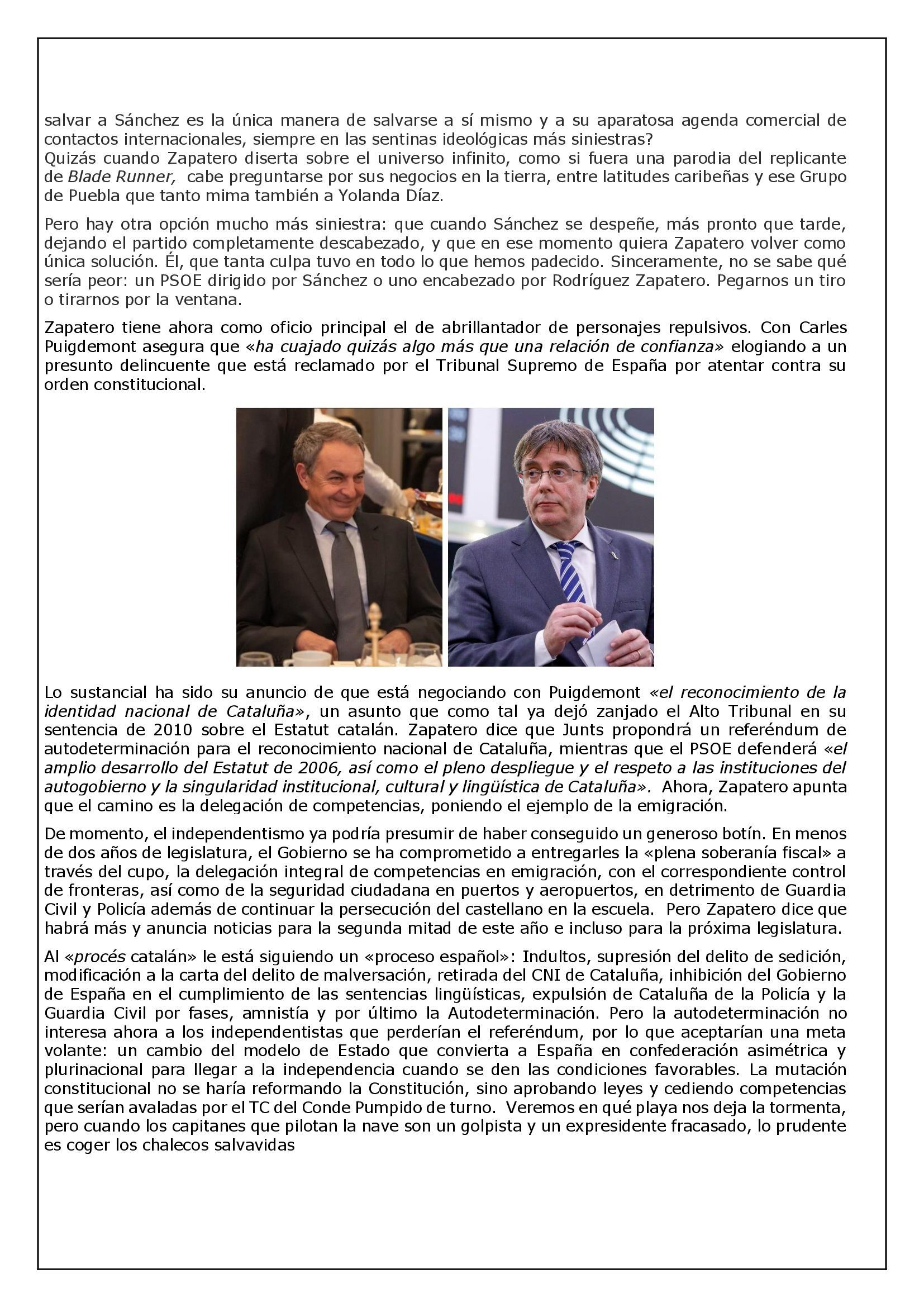 Al «procés catalán» le está siguiendo un «proceso español»: Indultos, supresión del delito de sedición, modificación a la carta del delito de malversación, retirada del CNI de Cataluña, inhibición del Gobierno de España en el cumplimiento de las sentencias lingüísticas, expulsión de Cataluña de la Policía y la Guardia Civil por fases, amnistía y por último la Autodeterminación. Pero la autodeterminación no interesa ahora a los independentistas que perderían el referéndum, por lo que aceptarían una meta volante: un cambio del modelo de Estado que convierta a España en confederación asimétrica y plurinacional para llegar a la independencia cuando se den las condiciones favorables. La mutación constitucional no se haría reformando la Constitución, sino aprobando leyes y cediendo competencias que serían avaladas por el TC del Conde Pumpido de turno. Veremos en qué playa nos deja la tormenta, pero cuando los capitanes que pilotan la nave son un golpista y un expresidente fracasado, lo prudente es coger los chalecos salvavidas