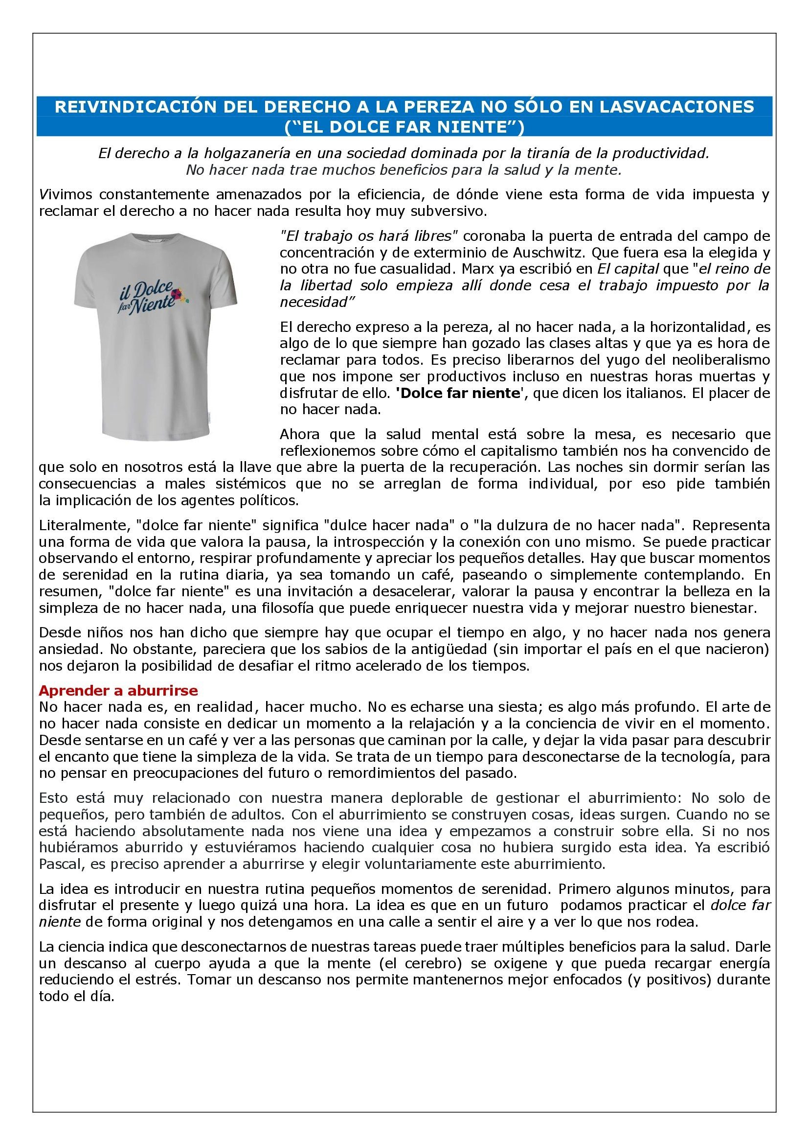El derecho expreso a la pereza, al no hacer nada, a la horizontalidad, es algo de lo que siempre han gozado las clases altas y que ya es hora de reclamar para todos. Es preciso liberarnos del yugo del neoliberalismo que nos impone ser productivos incluso en nuestras horas muertas y disfrutar de ello. ‘Dolce far niente‘, que dicen los italianos. El placer de no hacer nada.