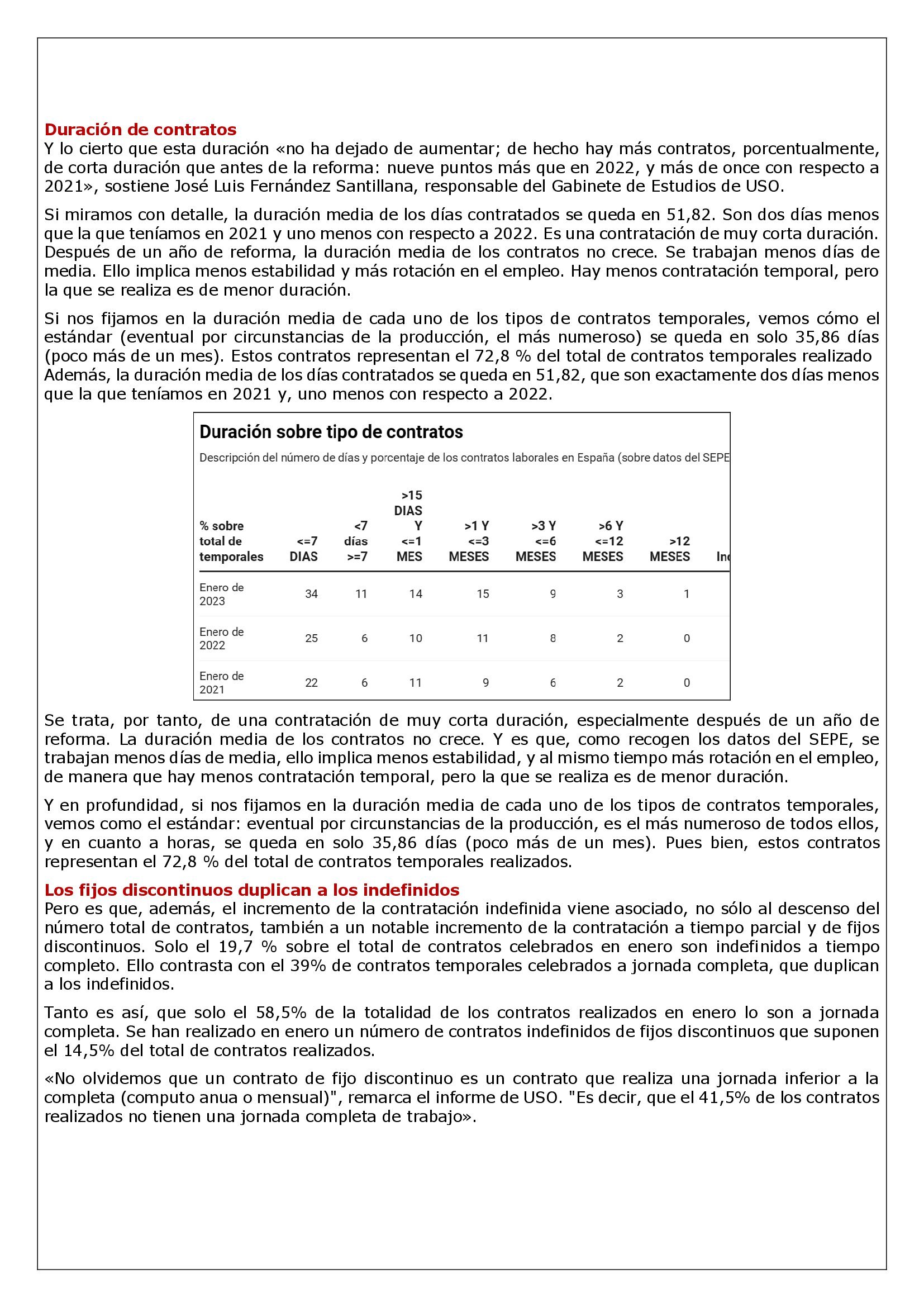 «No olvidemos que un contrato de fijo discontinuo es un contrato que realiza una jornada inferior a la completa (computo anua o mensual)», remarca el informe de USO. «Es decir, que el 41,5% de los contratos realizados no tienen una jornada completa de trabajo».