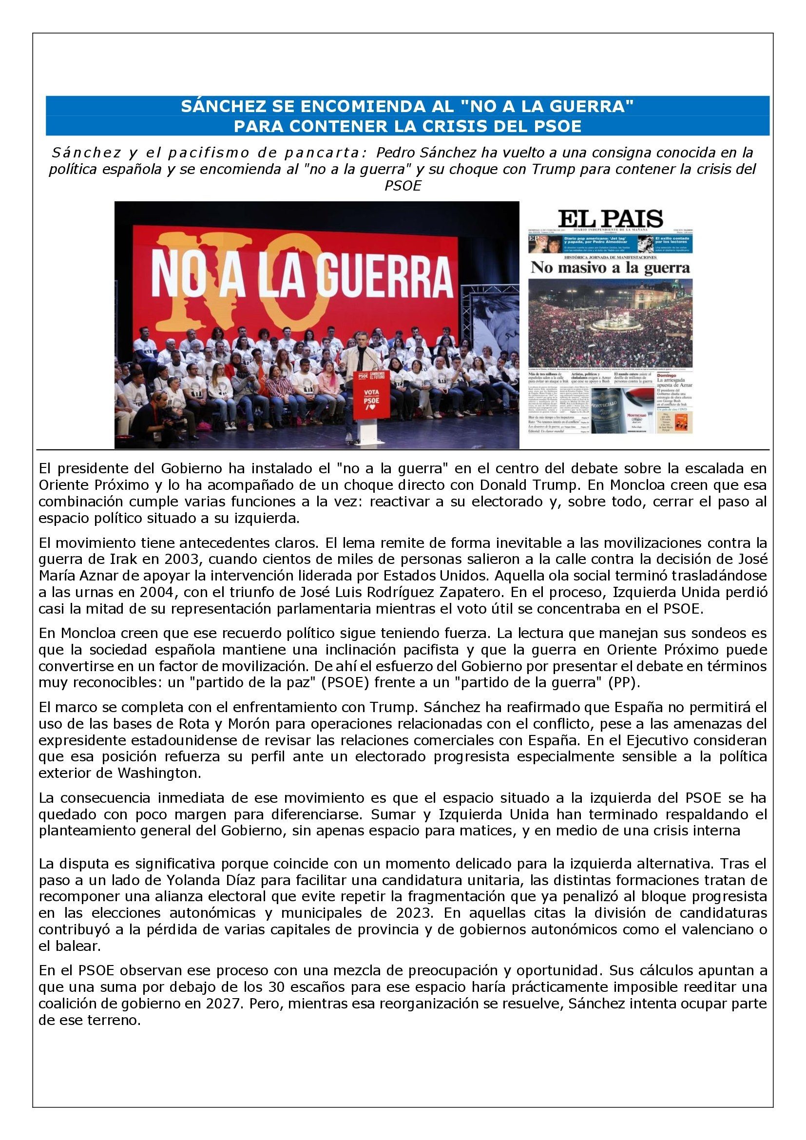 En Moncloa creen que ese recuerdo político sigue teniendo fuerza. La lectura que manejan sus sondeos es que la sociedad española mantiene una inclinación pacifista y que la guerra en Oriente Próximo puede convertirse en un factor de movilización. De ahí el esfuerzo del Gobierno por presentar el debate en términos muy reconocibles: un «partido de la paz» (PSOE) frente a un «partido de la guerra» (PP).