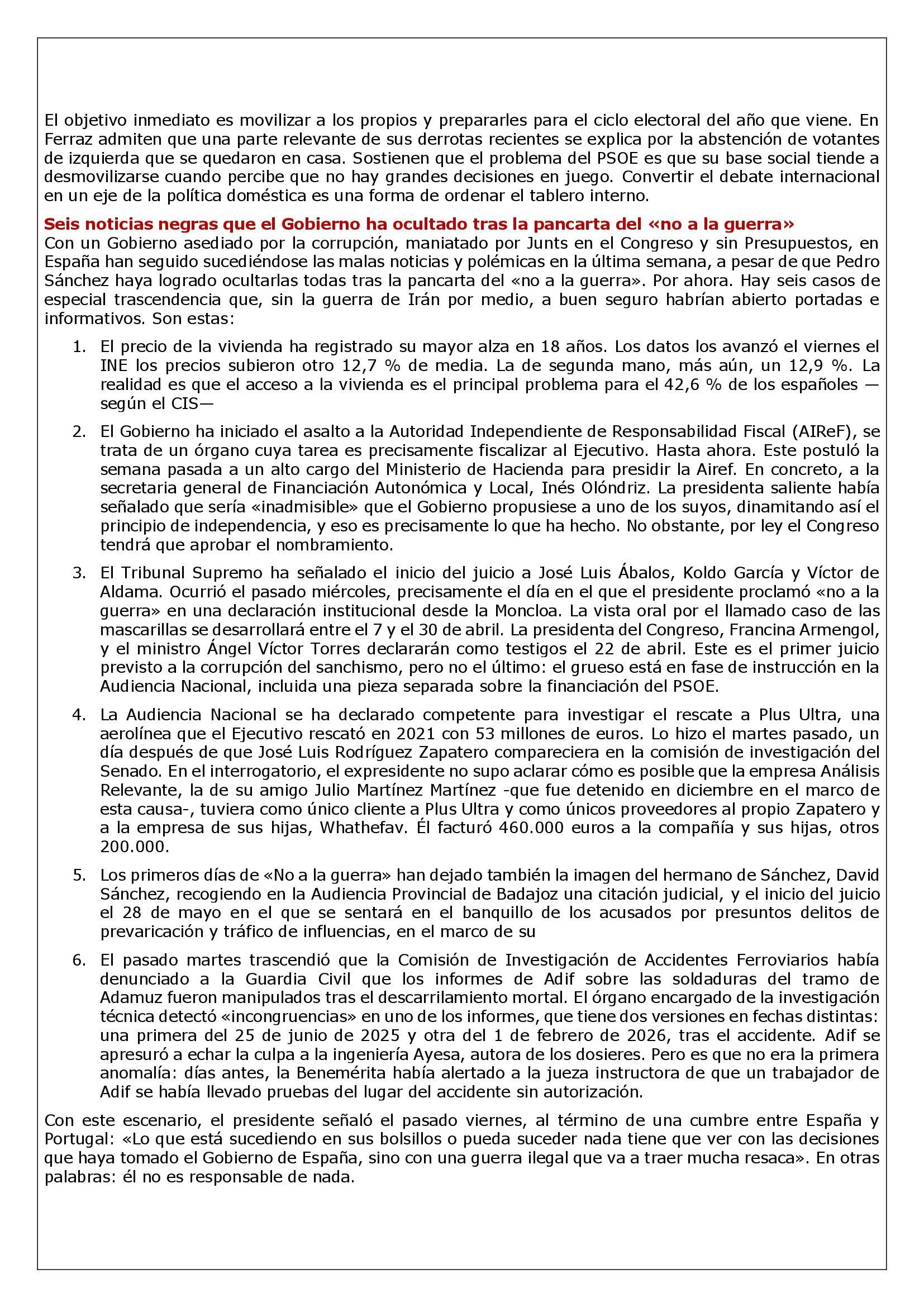 Con un Gobierno asediado por la corrupción, maniatado por Junts en el Congreso y sin Presupuestos, en España han seguido sucediéndose las malas noticias y polémicas en la última semana, a pesar de que Pedro Sánchez haya logrado ocultarlas todas tras la pancarta del «no a la guerra». Por ahora. Hay seis casos de especial trascendencia que, sin la guerra de Irán por medio, a buen seguro habrían abierto portadas e informativos. Son estas: