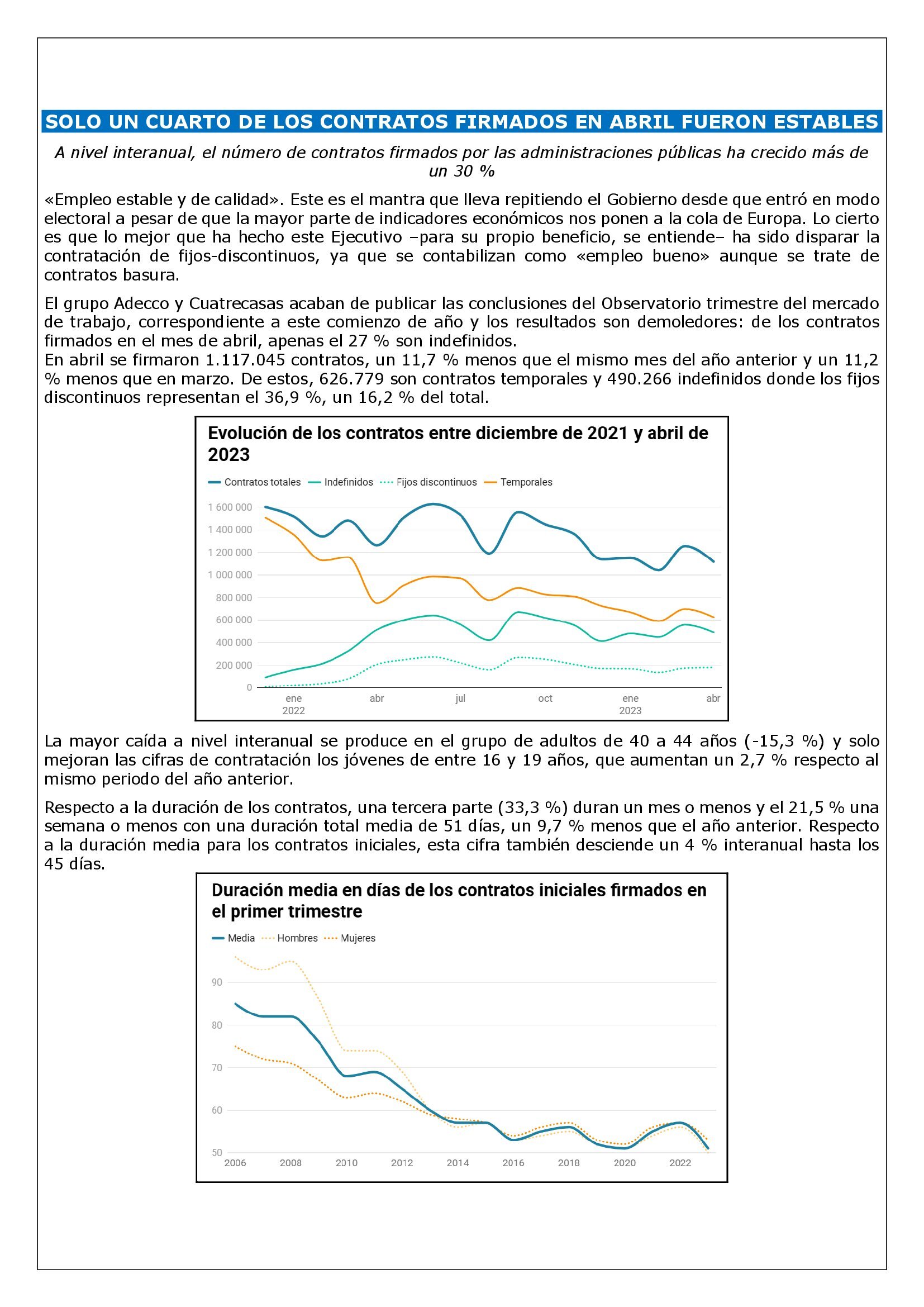 El grupo Adecco y Cuatrecasas acaban de publicar las conclusiones del Observatorio trimestre del mercado de trabajo, correspondiente a este comienzo de año y los resultados son demoledores: de los contratos firmados en el mes de abril, apenas el 27 % son indefinidos.