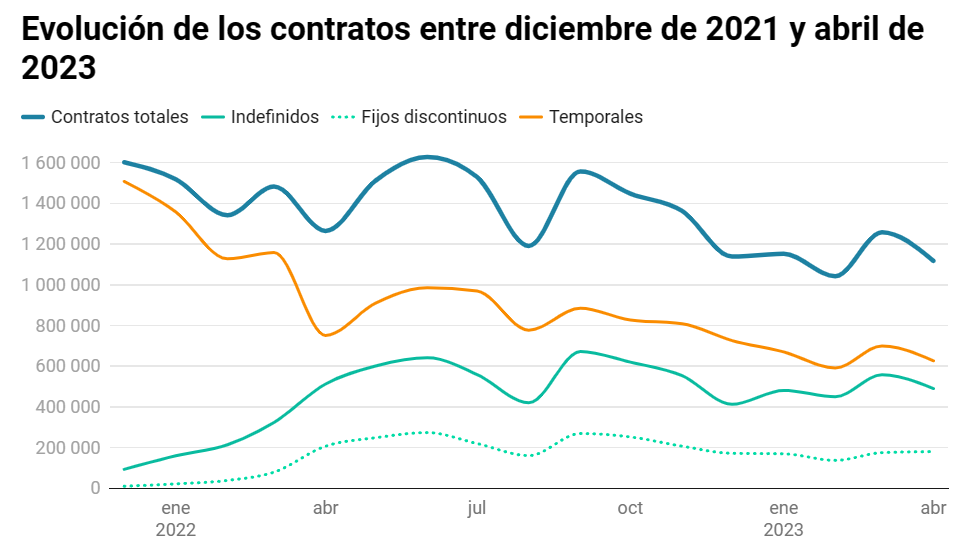 En abril se firmaron 1.117.045 contratos, un 11,7 % menos que el mismo mes del año anterior y un 11,2 % menos que en marzo. De estos, 626.779 son contratos temporales y 490.266 indefinidos donde los fijos discontinuos representan el 36,9 %, un 16,2 % del total.