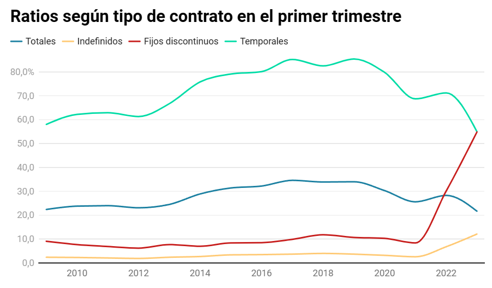Al comparar las ratios para el primer trimestre de forma anual se observa que la de los fijos discontinuos se dispara hasta el 55 % y bate el récord desde 2009, cuando se firmaron 483.487 contratos fijos discontinuos sobre 879.152 afiliados fijos discontinuos.