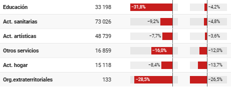 A nivel interanual, las caídas son más graves, ya que solo quedan en positivo el suministro energético con un escasísimo 1,3 % y las administraciones públicas, Defensa y Seguridad Social, que aumenta un 30,6 % pero se trata de un empleo no productivo y que genera un aumento de deuda pública.