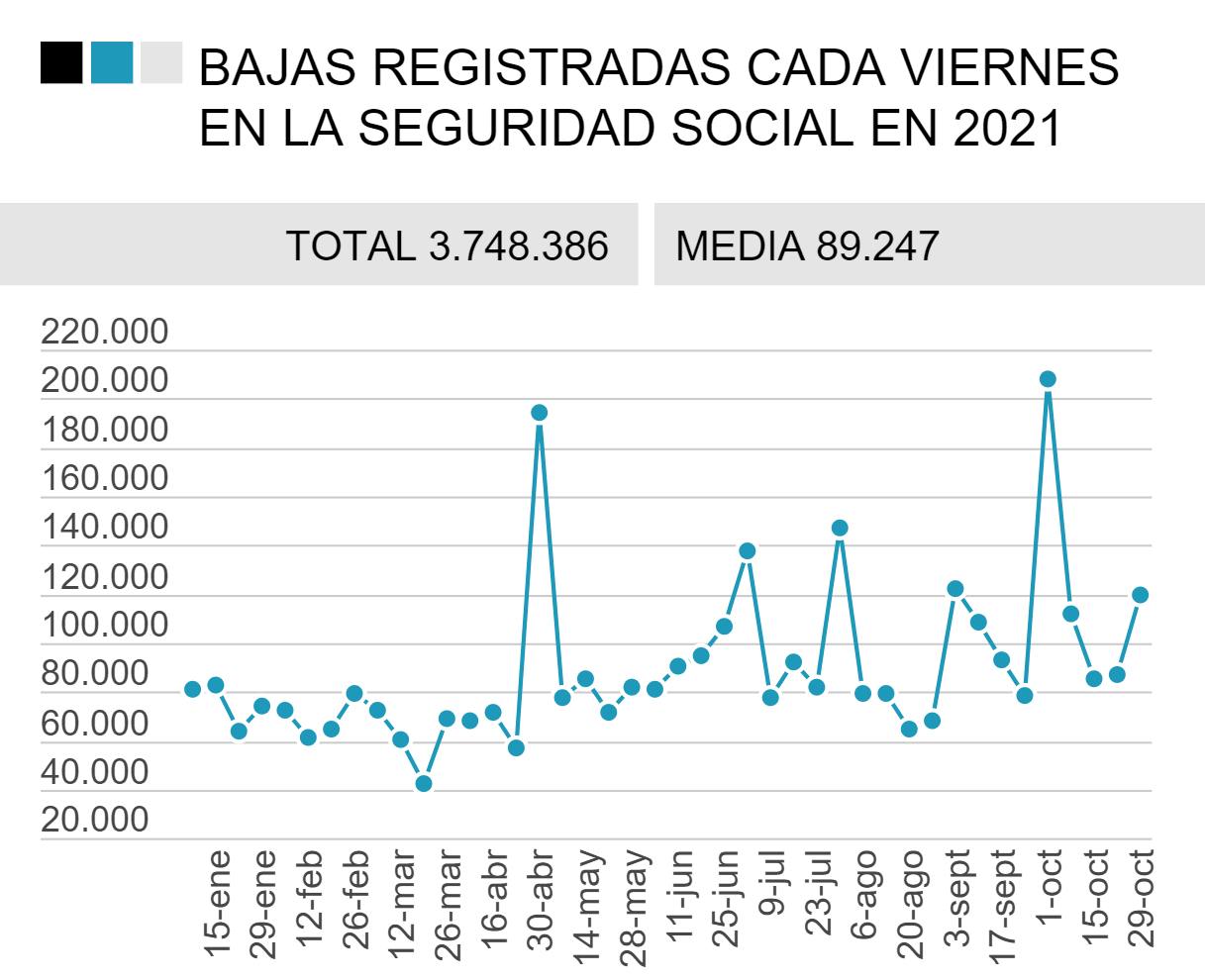 El registro histórico de la Seguridad Social revela que, efectivamente, los viernes son los días de la semana en los que se registran más bajas de afiliados, mientras los lunes son los días con más altas. Según los datos recopilados por este medio, en lo que va de año el sistema ha registrado una media de 90.000 bajas cada viernes. Para hacerse una idea, la cifra está entre la capacidad del Bernabéu (81.044 personas) y la del Camp Nou (99.345). Es como si cada viernes se fuera a la calle un estadio entero. En total, entre enero y octubre se han producido más de 3,7 millones de finalizaciones de contratos en el último día de la semana laboral. Del otro lado, las altas de los lunes suman 8,6 millones, a razón de algo más de 200.000 en cada jornada