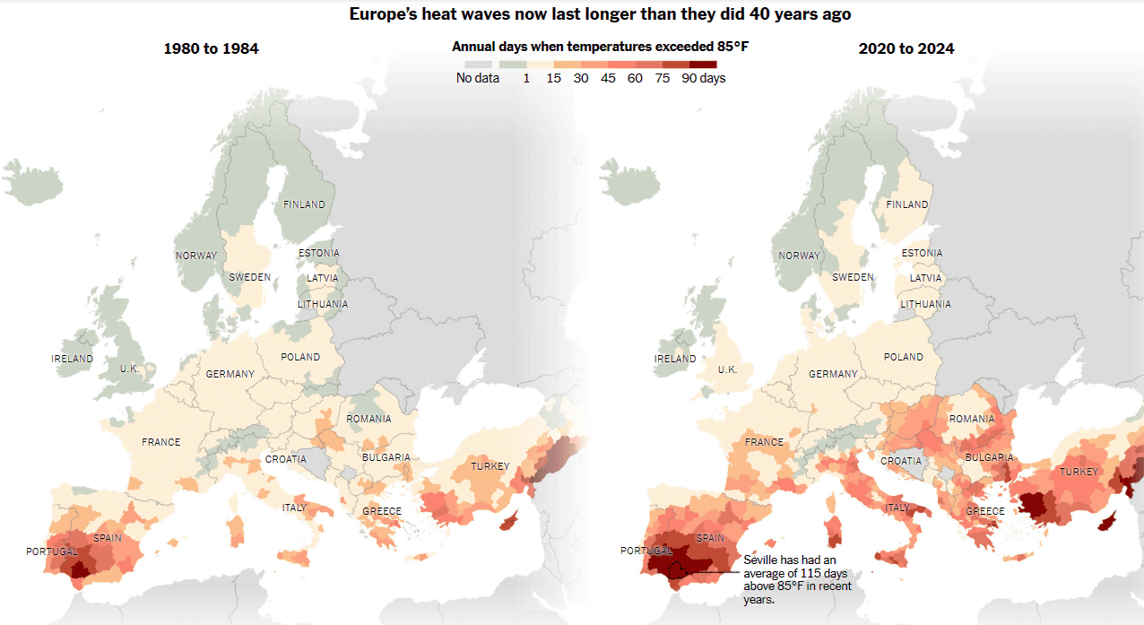 Gran parte del sur de Europa experimenta ahora más de dos meses al año en los que las temperaturas máximas diarias superan los 30º C. Madrid ha tenido una media de 63 días por encima de los 30º en los últimos años, frente a 29 días al año a principios de la década de 1980.