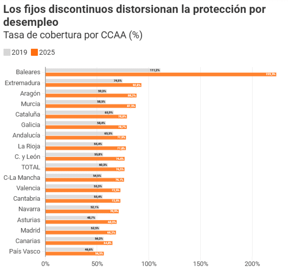 Las cifras acumuladas y mensuales, en cualquier caso, parecen reducidas para tener un impacto en la tasa de cobertura. Pero aquí hay que tener en cuenta otro factor: los fijos discontinuos no se comportan igual en todas las regiones. El caso paradigmático es Baleares: estos contratos son la base de su actividad turística, y eso se traduce en una elevada distorsión en las cifras, como reconoce el SEPE.