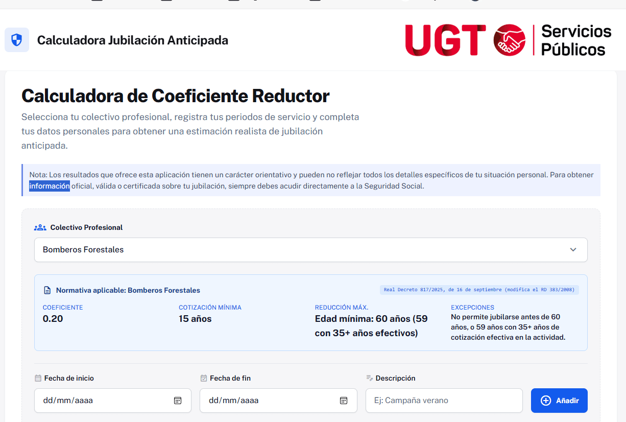 una herramienta fácil de usar, con resultados orientativos, diseñada para ofrecer información clara y útil sobre la aplicación del coeficiente reductor en la jubilación. Está pensada específicamente para los colectivos de: