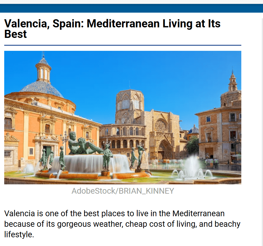 Entre las principales virtudes de España este medio americano señala el bajo coste de vida en comparación a la calidad de la misma y al sistema sanitario, nuestra rica historia y cultura, apreciándose en música, gastronomía, viticultura, arte, arquitectura y diseño o festivales; y la diversidad de nuestra geografía, con multitud de montañas, valles, ríos e islas. Es curioso que identifique el hecho de que nuestro país es el segundo más montañoso del continente, tras Suiza, como la razón de la diversidad cultural existente.