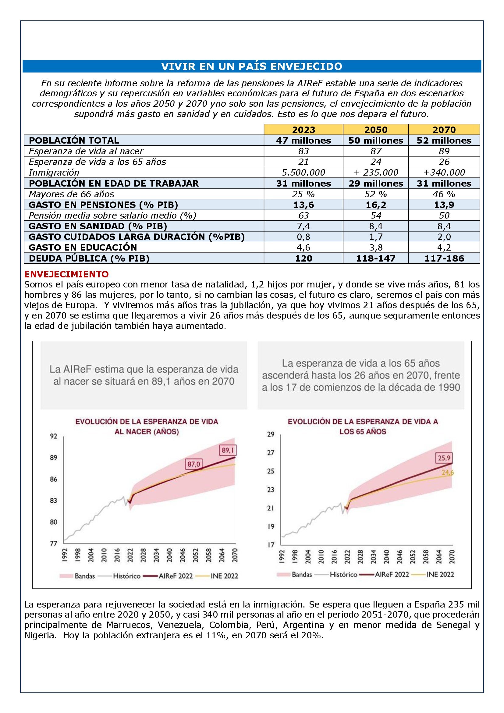 En su reciente informe sobre la reforma de las pensiones la AIReF estable una serie de indicadores demográficos y su repercusión en variables económicas para el futuro de España en dos escenarios correspondientes a los años 2050 y 2070 yno solo son las pensiones, el envejecimiento de la población supondrá más gasto en sanidad y en cuidados. Esto es lo que nos depara el futuro.
