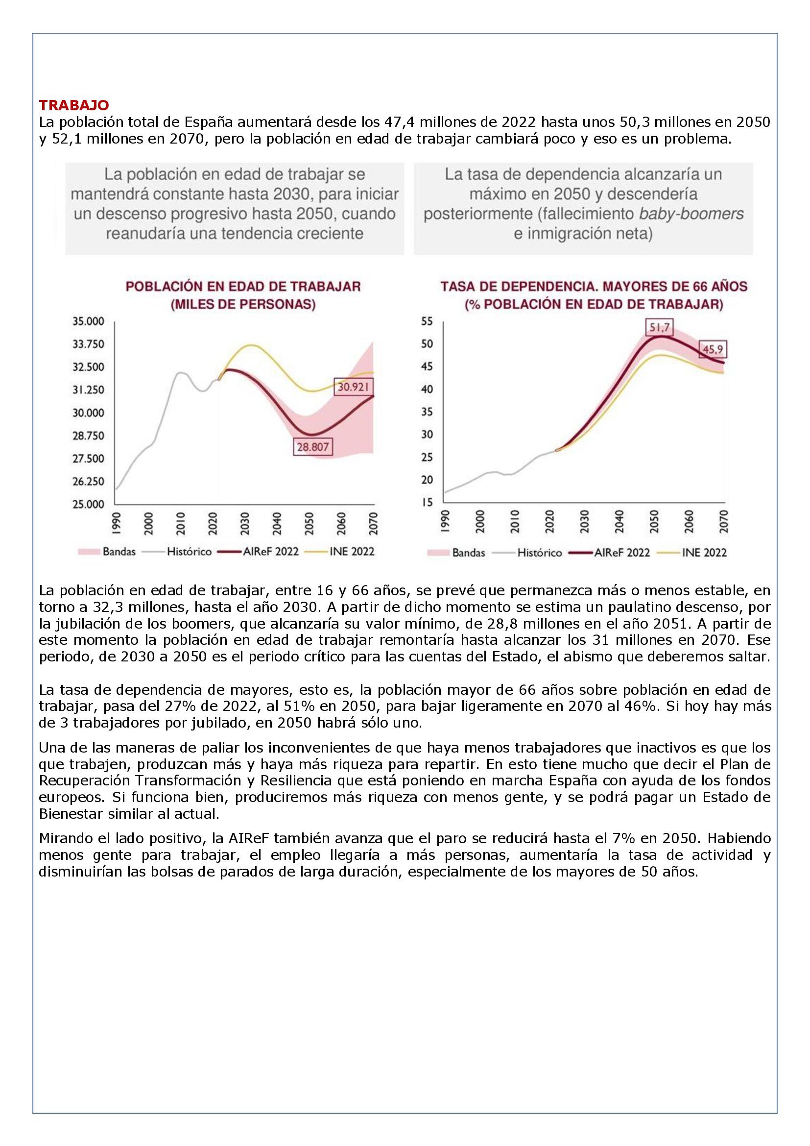 La tasa de dependencia de mayores, esto es, la población mayor de 66 años sobre población en edad de trabajar, pasa del 27% de 2022, al 51% en 2050, para bajar ligeramente en 2070 al 46%. Si hoy hay más de 3 trabajadores por jubilado, en 2050 habrá sólo uno.