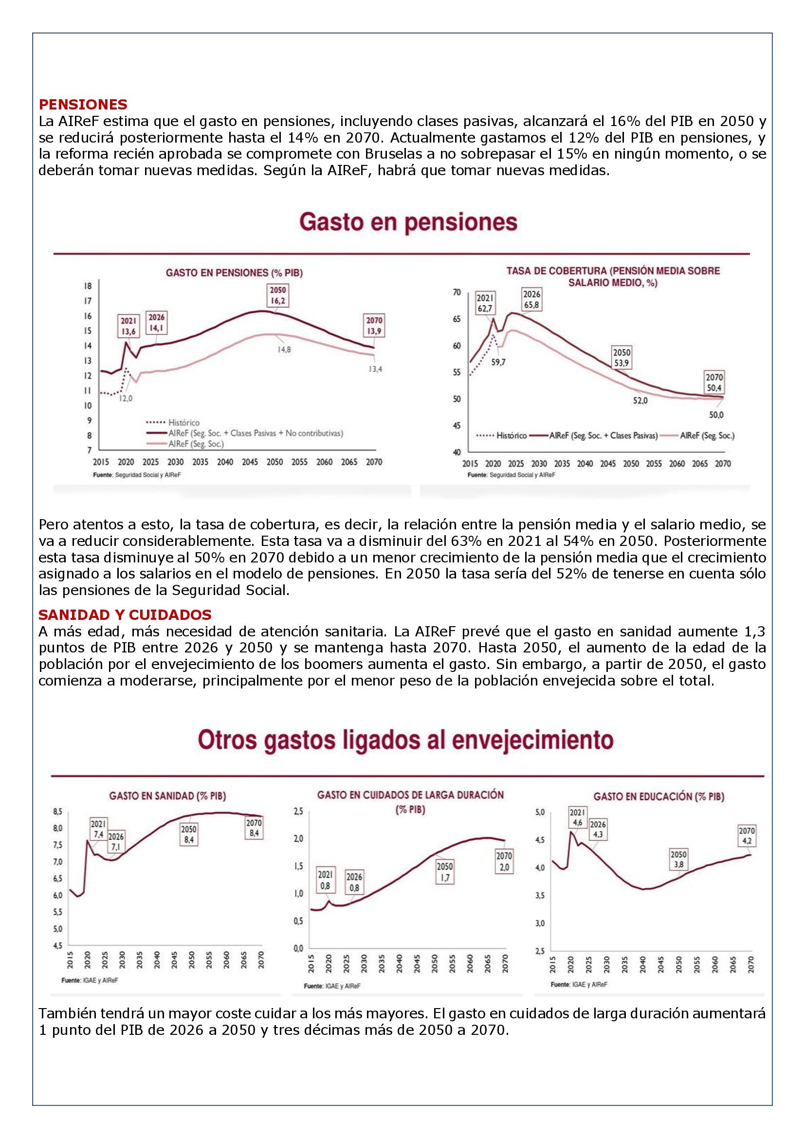 La AIReF estima que el gasto en pensiones, incluyendo clases pasivas, alcanzará el 16% del PIB en 2050 y se reducirá posteriormente hasta el 14% en 2070. Actualmente gastamos el 12% del PIB en pensiones, y la reforma recién aprobada se compromete con Bruselas a no sobrepasar el 15% en ningún momento, o se deberán tomar nuevas medidas. Según la AIReF, habrá que tomar nuevas medidas.