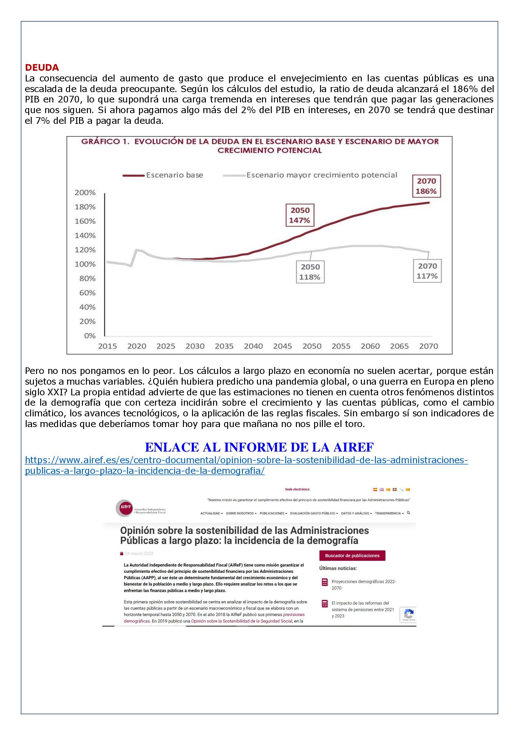 La consecuencia del aumento de gasto que produce el envejecimiento en las cuentas públicas es una escalada de la deuda preocupante. Según los cálculos del estudio, la ratio de deuda alcanzará el 186% del PIB en 2070, lo que supondrá una carga tremenda en intereses que tendrán que pagar las generaciones que nos siguen. Si ahora pagamos algo más del 2% del PIB en intereses, en 2070 se tendrá que destinar el 7% del PIB a pagar la deuda.