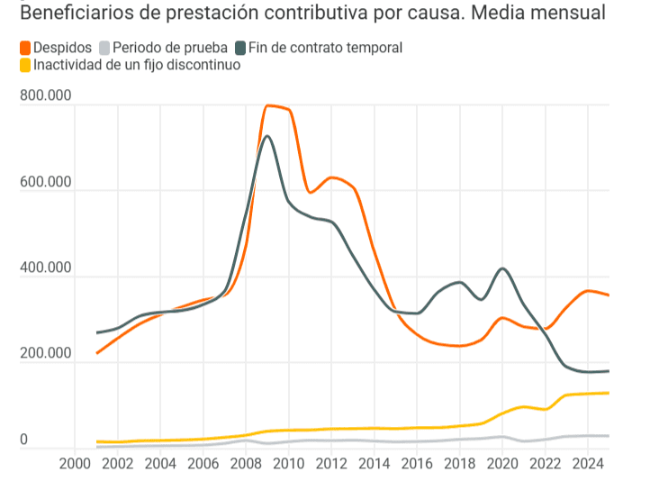 Por su parte, solo 29.074 personas que perdieron su trabajo por no superar el periodo de prueba percibía la prestación de media al mes en 2025, un porcentaje 73% superior al de 2021, pero que confirma que sus menores periodos cotizados conducen a que reciban las ayudas durante menos tiempo.